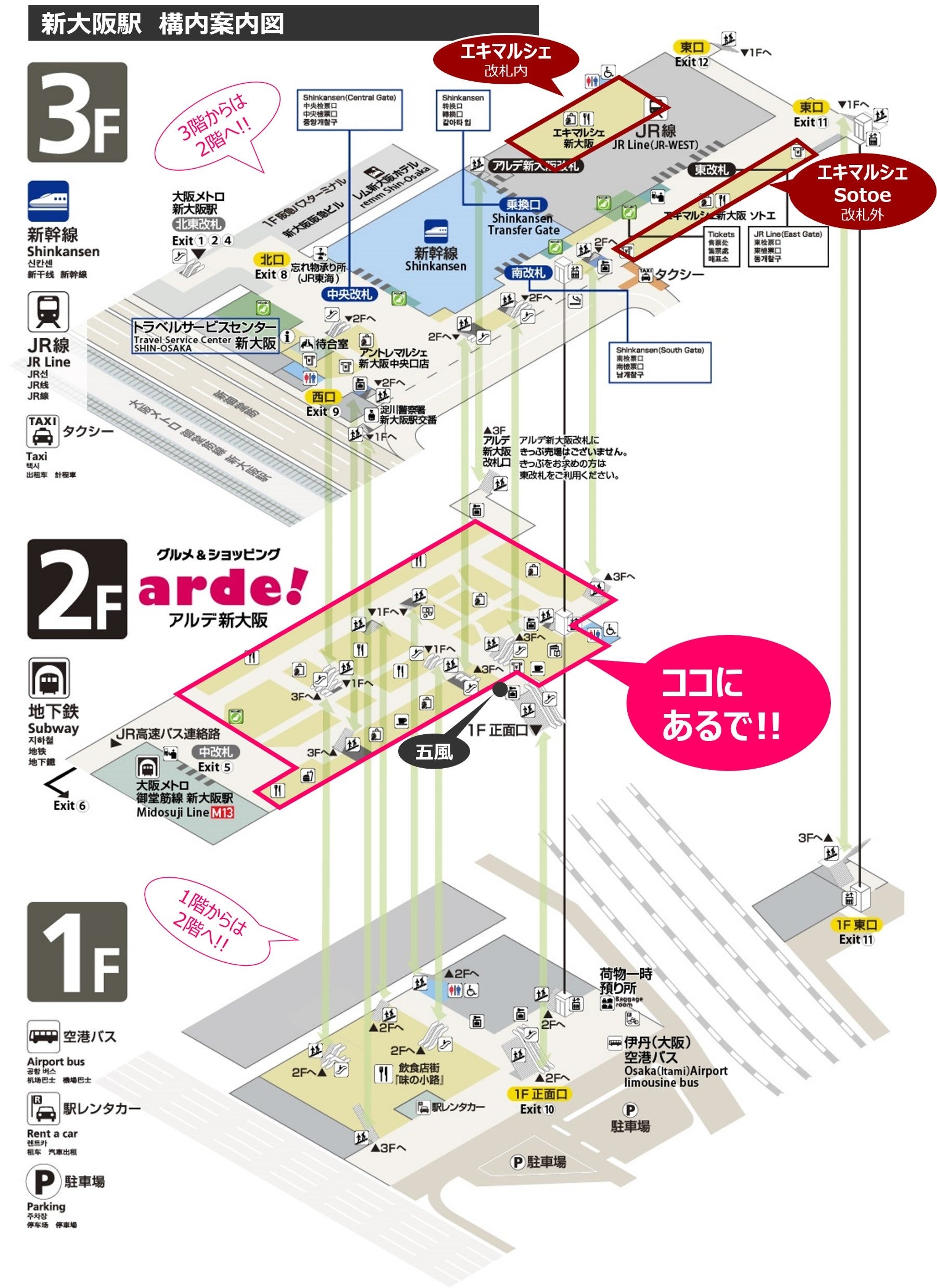 「アルデひろば」には、メインの「アルデひろば」と、「アルデひろば ╋(プラス)」がございます。新大阪駅各改札・正面口から、徒歩1~2分のロケーションです。新大阪駅ご利用の際には、ぜひお立ち寄りください。