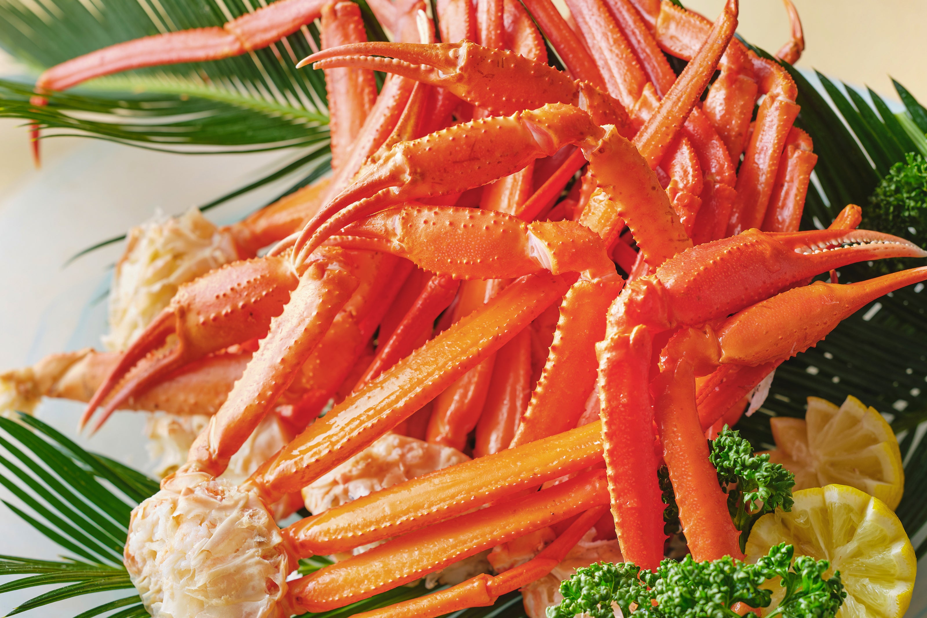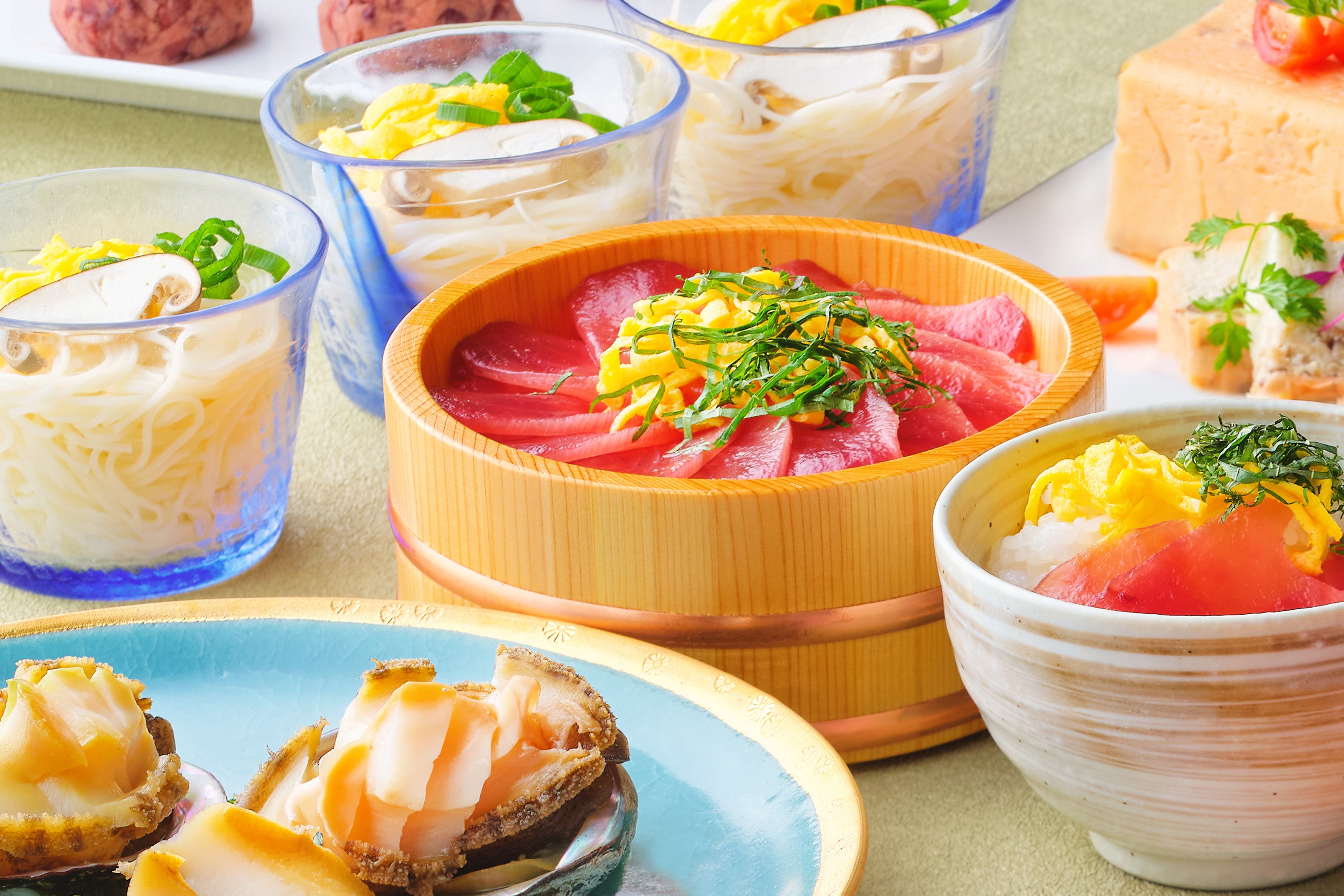牛ロース肉のステーキ トリュフ風味のソース / 北海道産ボイル蟹 / チキンとポークのグリエ / パテ ド カンパーニュ / スモークサーモン / 鯛の紅白道明寺蒸し みぞれおろし / 握り寿司 / 黒豆 / 紅白なます / 出し巻き玉子 など