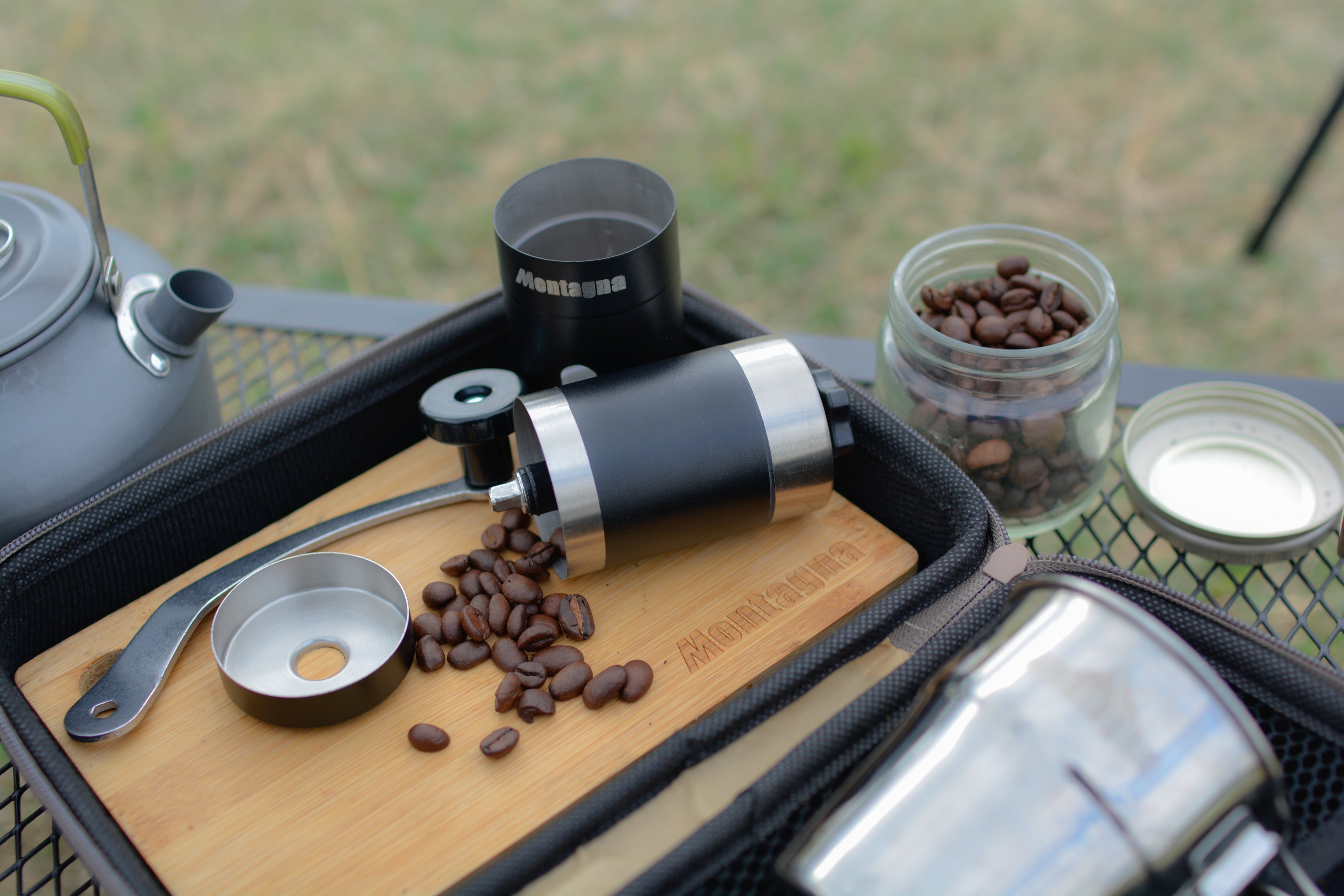 特徴:ソロキャンにぴったりなコーヒー1杯分(豆:10~20g)が挽けるコーヒーミル。手動式でハンドルを回すだけで簡単にコーヒー豆を挽けます。粗挽き・中挽き・細挽きと粗さ調整が可能。スタイリッシュなブラックで見た目もお洒落。