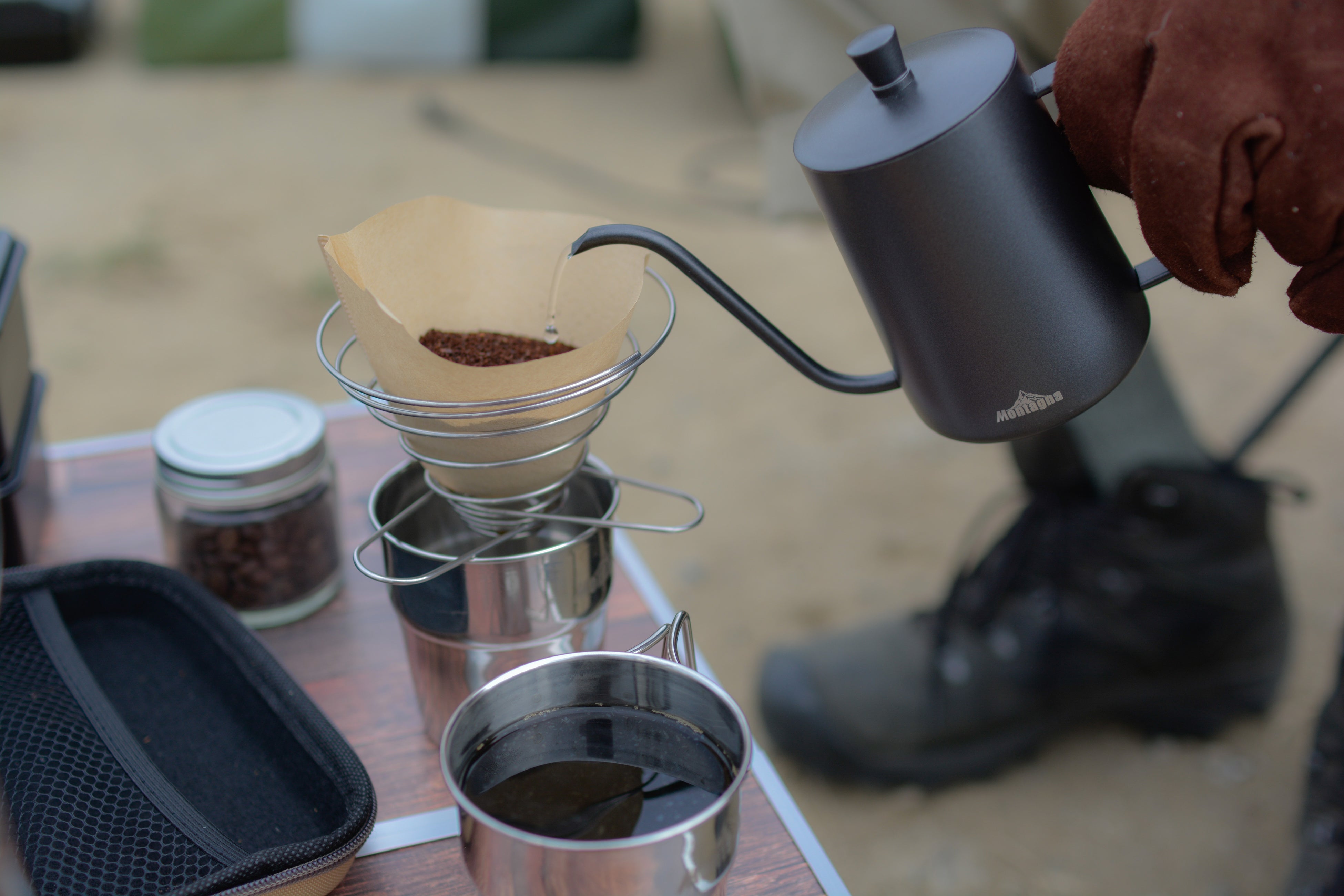 特徴:ソロキャンにぴったりなコーヒー1杯分(350ml)をドリップできるット。注ぎ口は極細で湯量をコントロールしやすく使いやすい。スタイリッシュなブラック仕様。