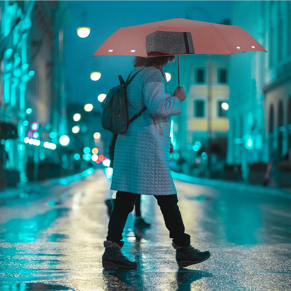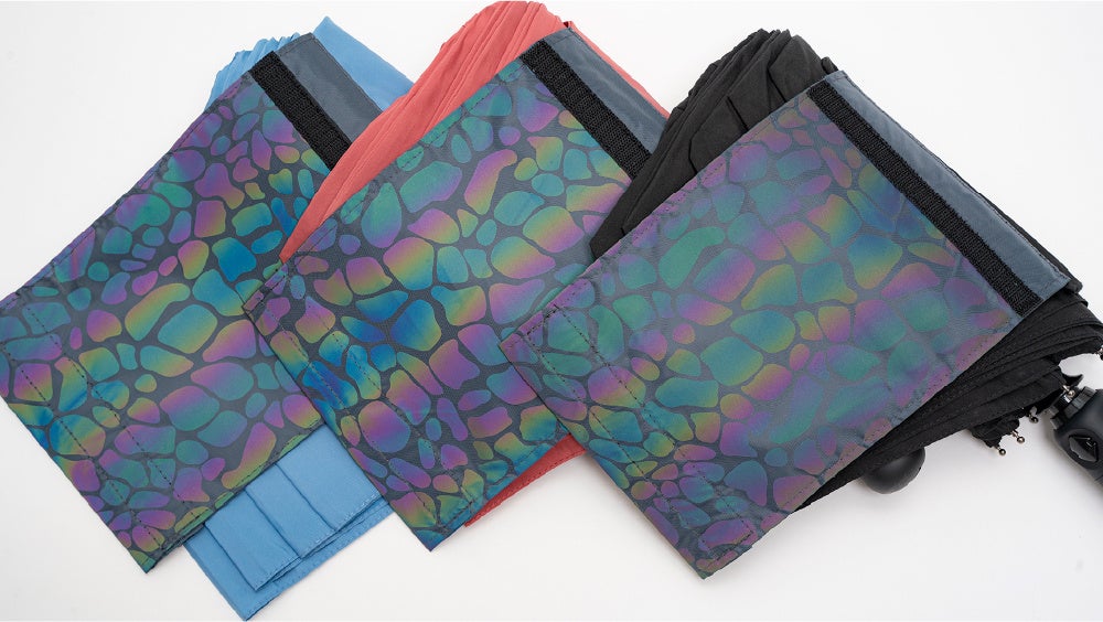 「A.Brolly Tube Flash」は、傘の周りに光を反射する素材を採用し、光の反射でドライバーにより気付かれやすいように設計しています。また、反射素材は傘の全方面に取り入れており、360度どの方向から車が来てもしっかり反射でき、ドライバーに気付かれやすいようになっています。