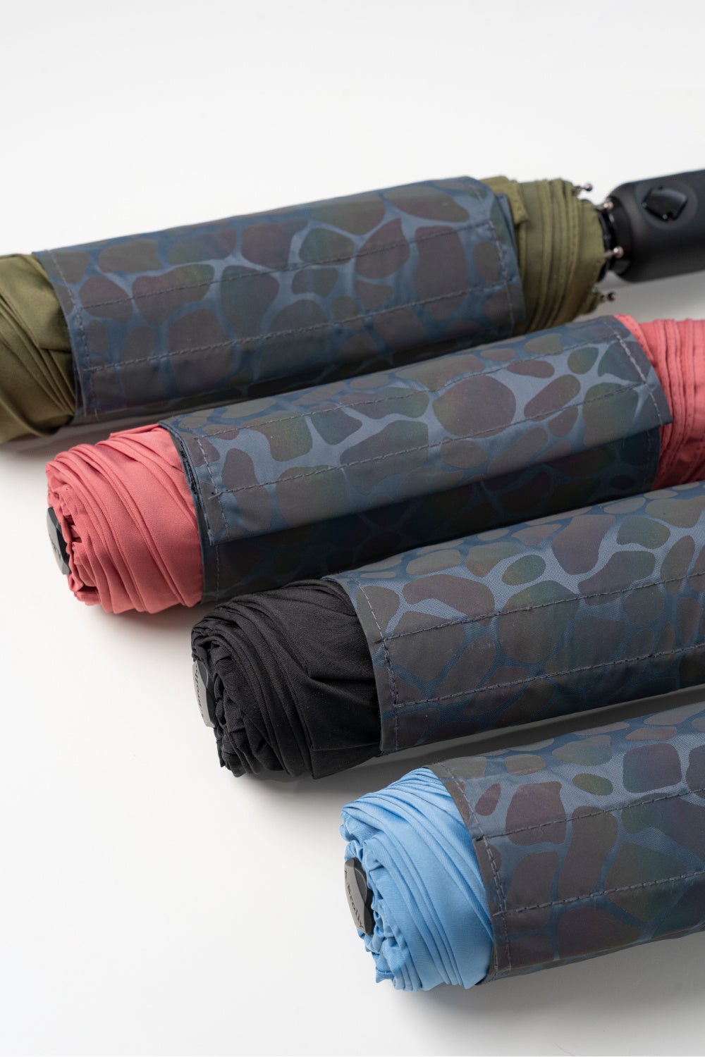 それらのタイプでは、傘を綺麗に収納するのがなかなか難しく、手間がかかる場合が多いです。それに対して、「A.Brolly Tube Flash」の収納紐(ベルト)は大きくデザインされており、傘全体をカバーし、簡単に綺麗な形にまとめることができます。