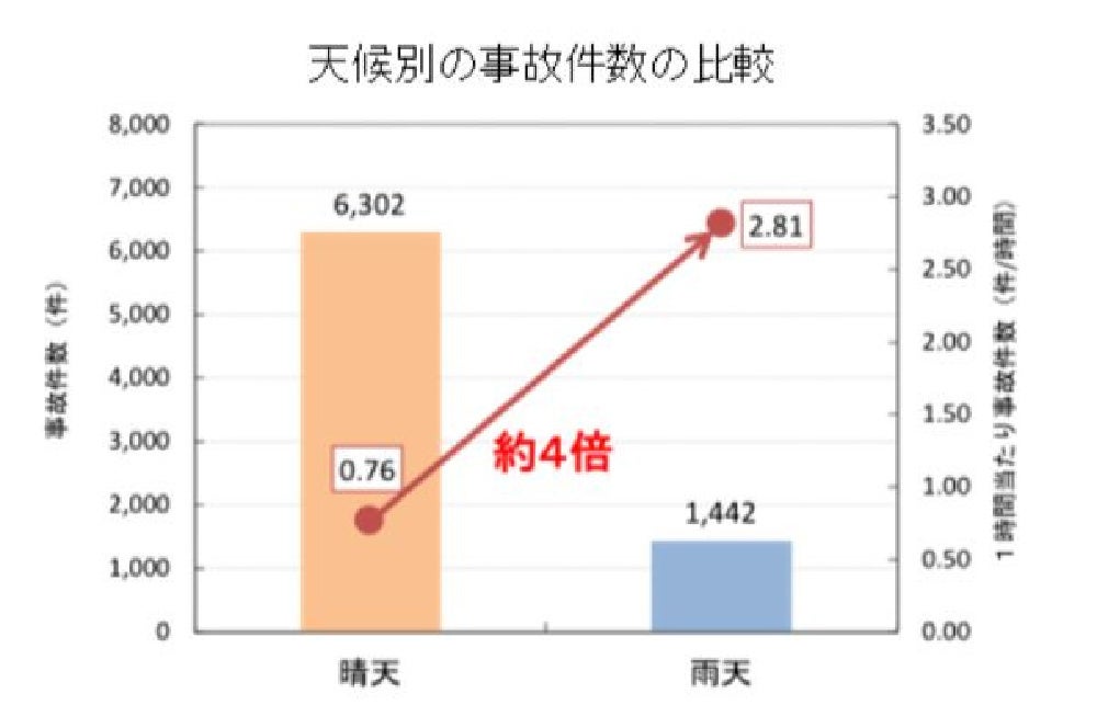 更に首都高ドライバーズサイトによると、雨天の交通事故発生率は晴天時に比べ約4倍高まると言われています。2021年度を例にとると、雨天の時間は年間総時間の約6%程度であるにも関わらず、雨天時に発生した交通事故件数は総交通事故件数の18.6%を占めています。雨天時には雨天時以外と比較し交通事故が非常に発生しやすい状況にあるといえます。