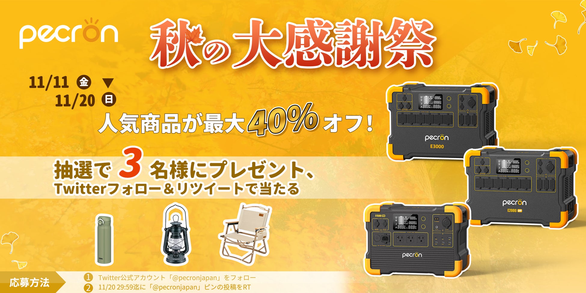 プレゼント抽選について、キャンペーン期間中にPecron公式Twitterアカウント(@pecronjapan)をフォローして、該当する投稿をリツイートすると、その場で合計3名様にプレゼントが当たる!