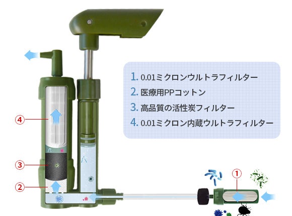 汚れた水も瞬時に清潔な水へ、アウトドア、災害時に水を確保◎【工具不要・4段階浄水・お手入れ簡単】