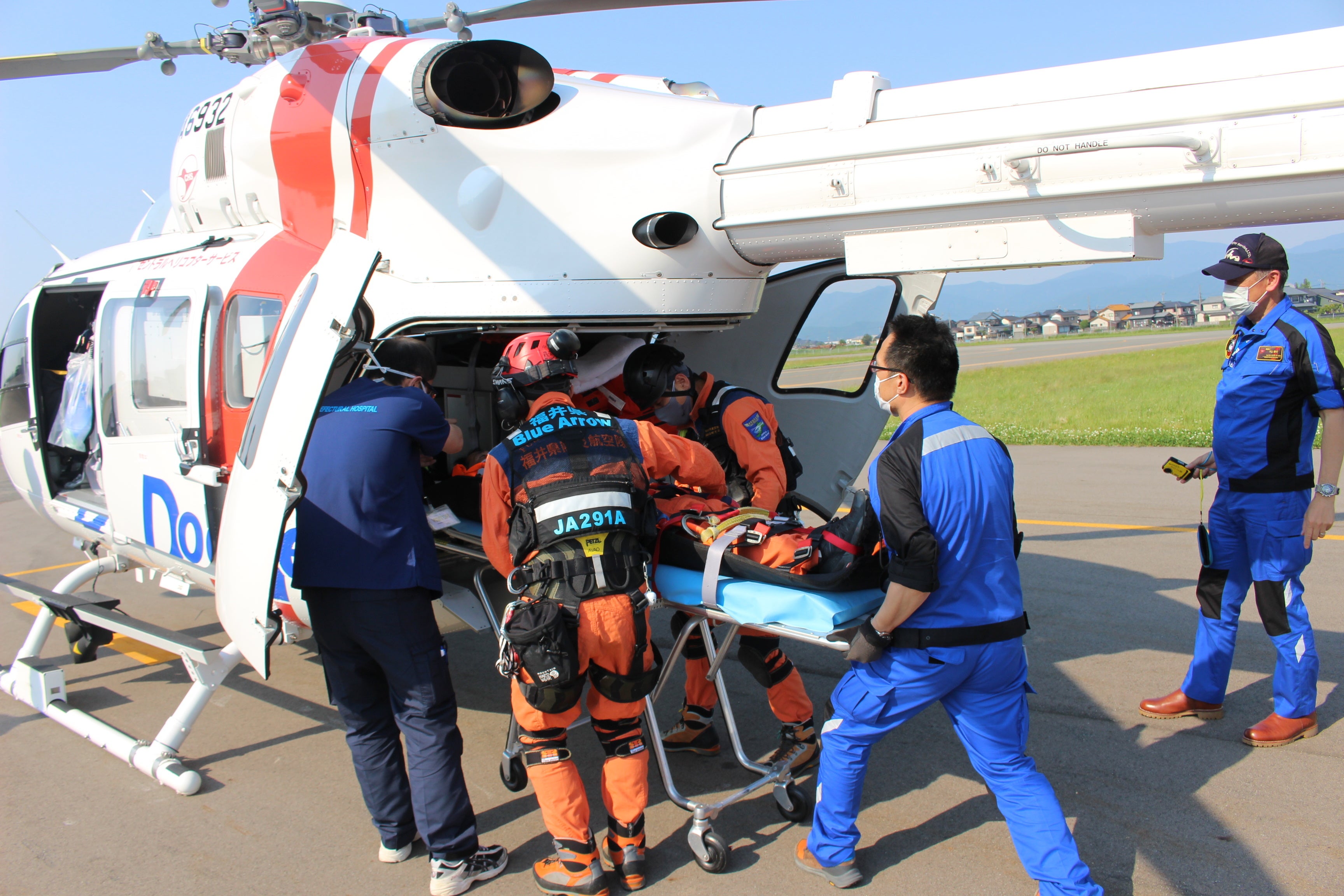 先に離陸した福井県警航空隊により捜索を開始。要救助者5名を発見。降下した隊員より5名のうち3名は健常、転倒した1名は容態急変(意識無し)、残り1名は低体温の初期症状があることが判明。直ちに現場指揮本部経由でドクターヘリの現地要請。ドクターヘリ現地到着に時間を要することから福井県警察航空隊は急変した患者を早期にピックアップし、福井大学医学部付属病院へ搬送。