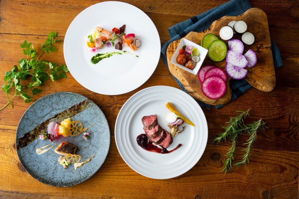 旬を迎える根菜や日本海産の魚介を取り入れた、冬の信州を味わうディナーコース。メインの肉料理には、長野メルローを使ったシェフ特製ワインソースをかけて。コク深い一皿をご堪能ください。