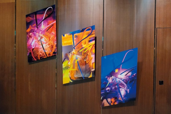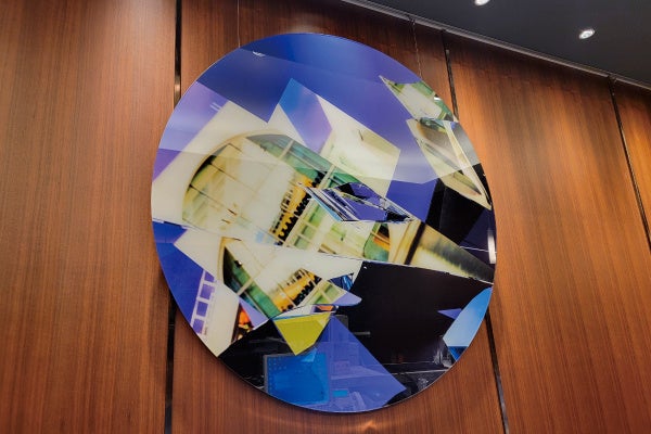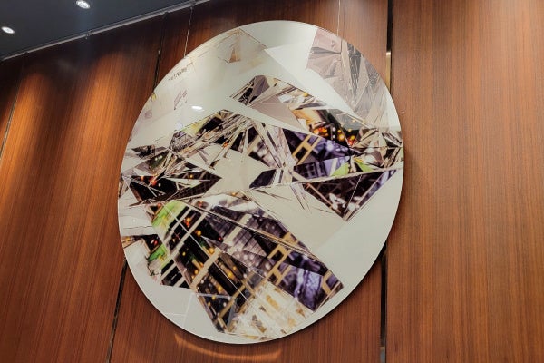 展示では、割れた鏡に都市風景が映り込む景色をCG で制作し、高画質で印刷した円形のアクリルマウント