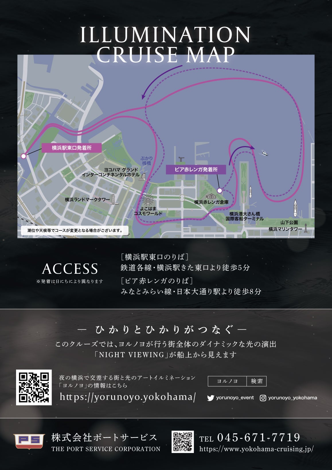 横浜港の素敵な景色を見ながらクルーズを楽しめるシーバスとヨルノヨがコラボレーションし、期間限定でヨルノヨ特別便「イルミネーションクルーズ」を運航します。このクルーズでは、暖房完備の温かい船内から、ヨルノヨが行う光と音楽の演出「NIGHT VIEWING」をガイドの解説付きで見ることができます。また、「NIGHT VIEWING」鑑賞時は、会場で流れる音楽が船内でも流れます。