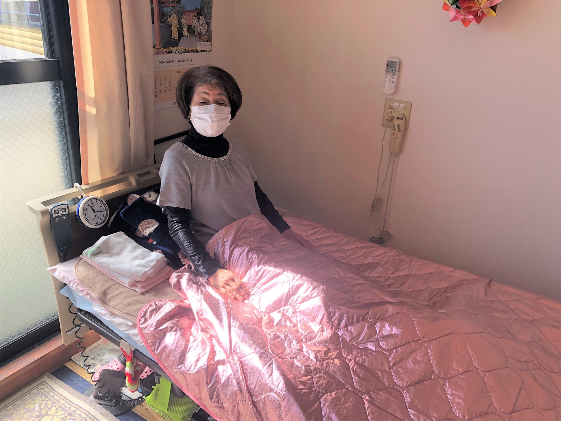 (写真=大人のベッドカバーをかけ、「布団の枚数を少なくしても暖かい」と話す老人ホーム入居者)