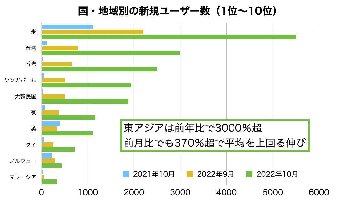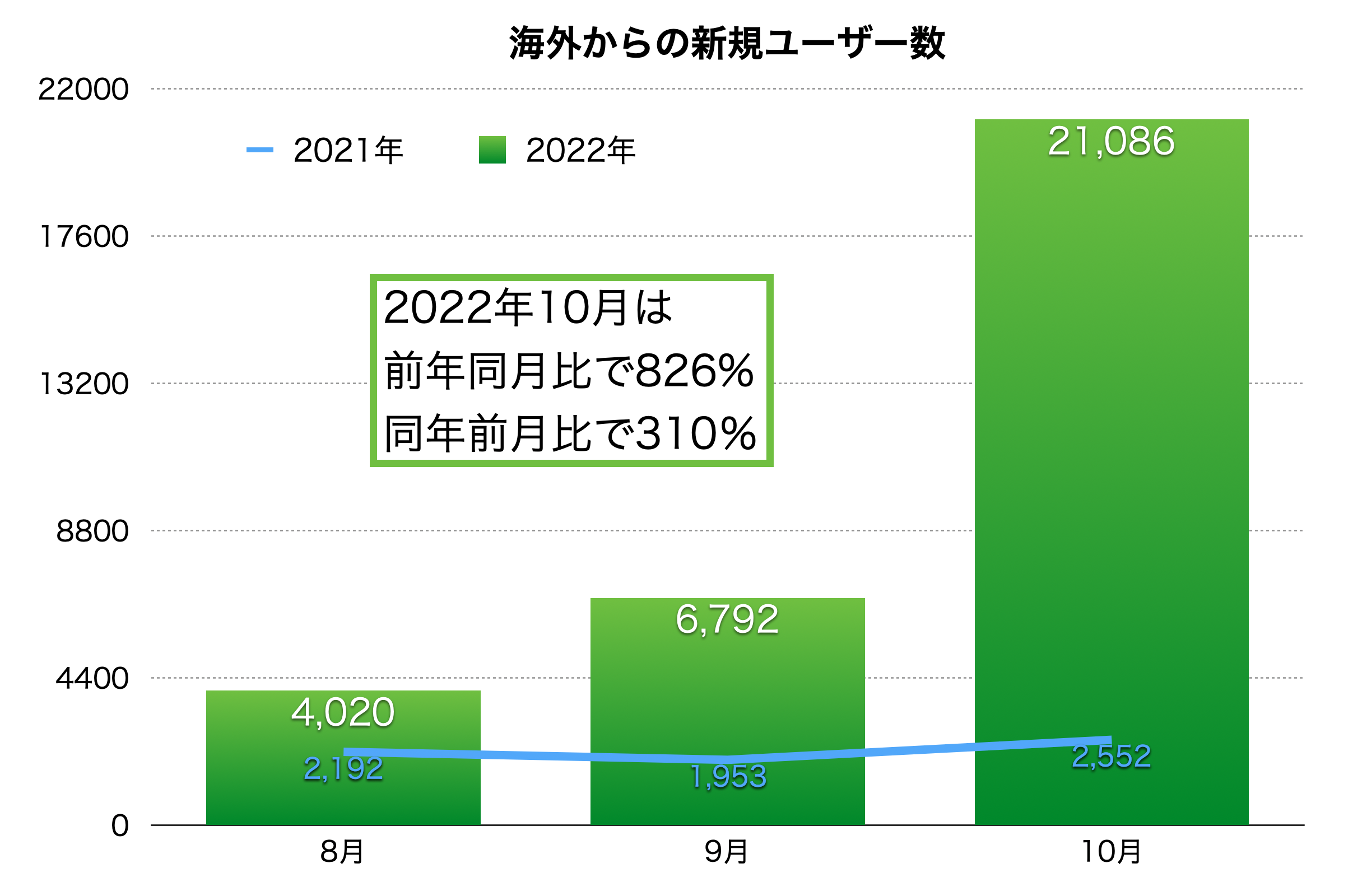 2021年と2022年の8月〜10月に『talkappi』へ問合せをした海外からの新規ユーザー数です(全89国・地域)。2021年は前月比で120%前後で逓増し、2022年の9月は168%と大きく伸びましたが、2022年の10月には310%とさらに飛躍しました。前年同月比では826%となります。これまでも段階的な規制緩和がありましたが、10月の緩和の影響がいかに大きかったかを表しています。