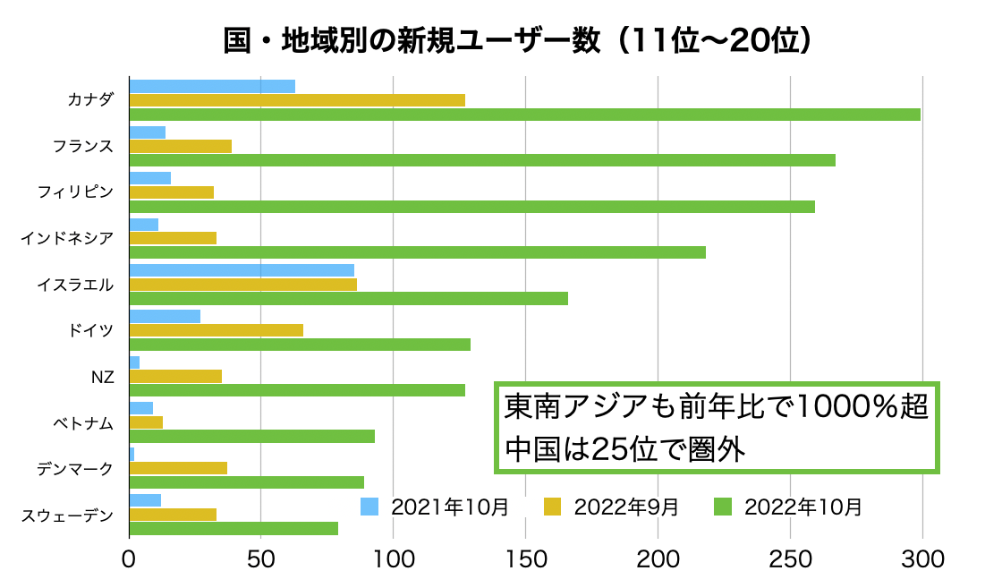 ・国・地域別の新規ユーザー数(全89国・地域のうち、11位〜20位)