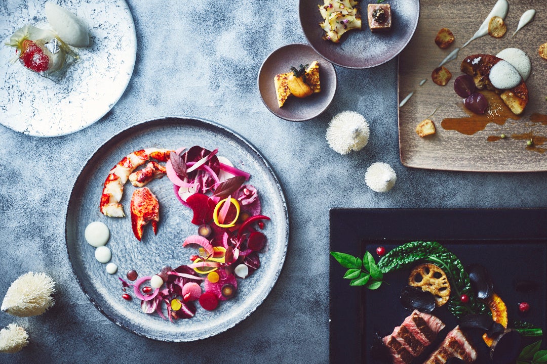 - オマール海老の鉄板焼 冬野菜のサラダ 柚子とザクロのドレッシング