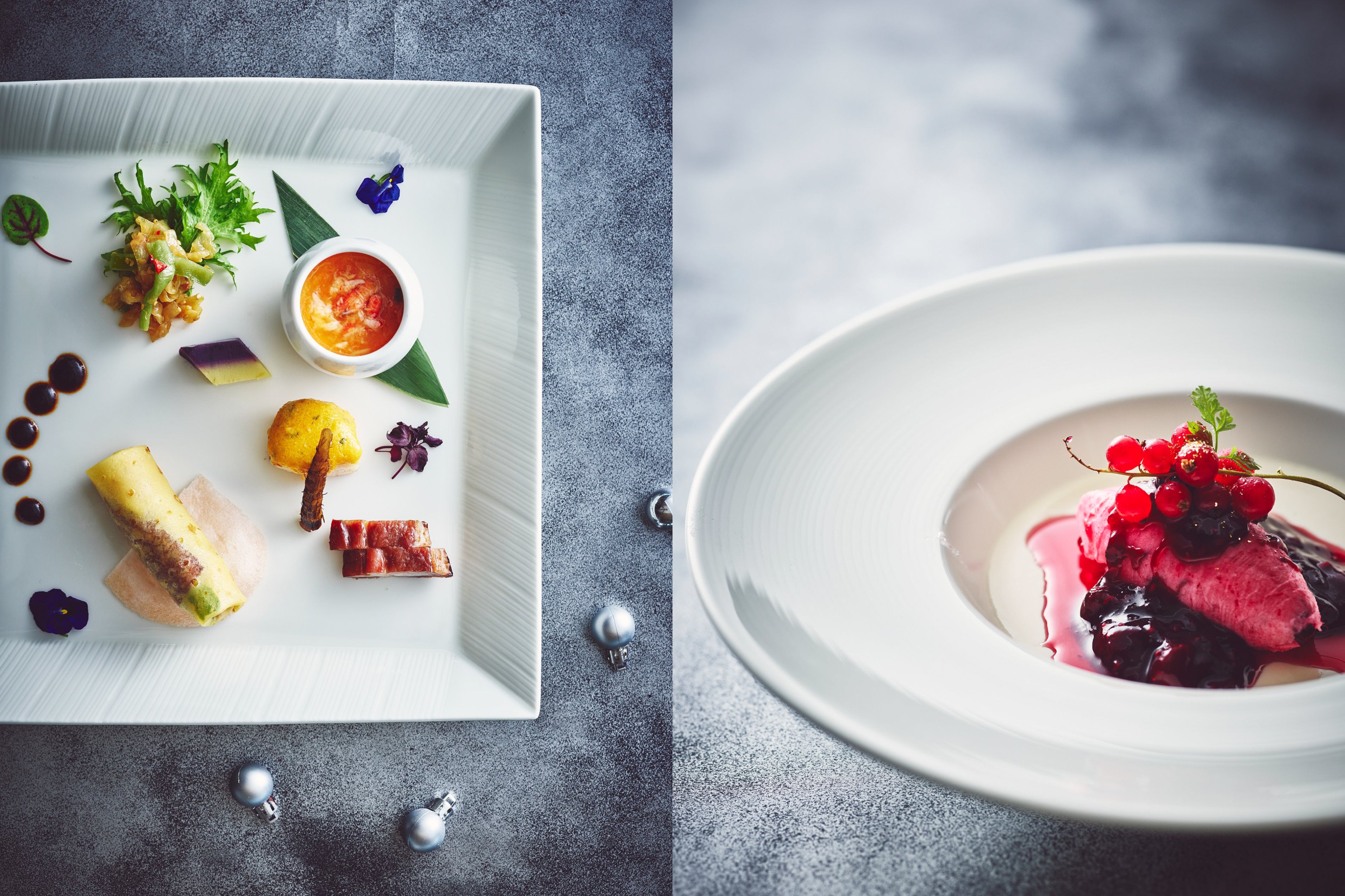 一口サイズが愉しいバラエティ豊かな6種の前菜盛り合わせから始まるチャイナシャドーのクリスマスコースは、つづくスープやグラタンなど、広東料理のベーシックを守りながらも、聖なる夜を祝うためにふさわしいエレガントな装いで、ロマンチックなひとときを演出します。