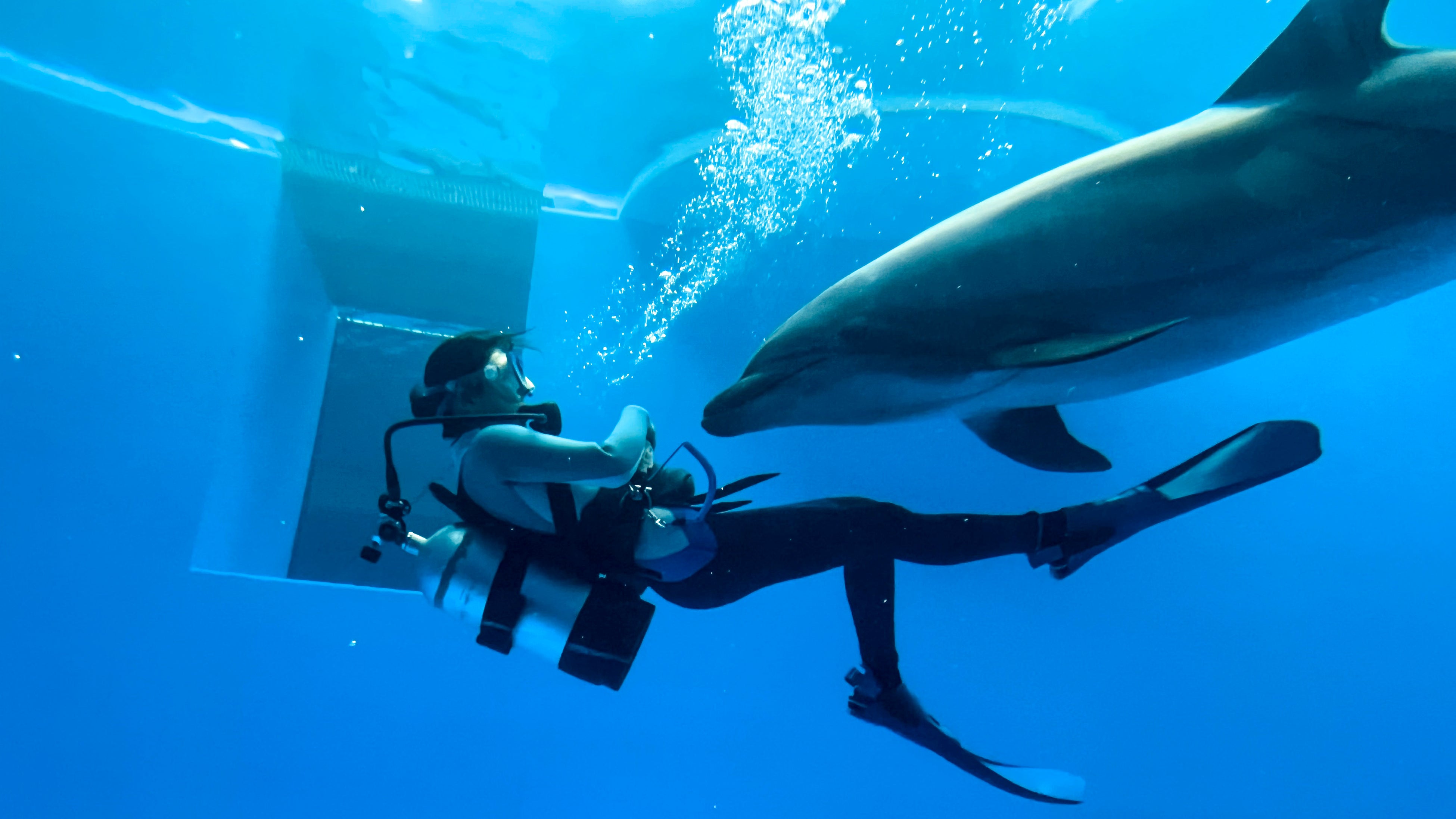「Art of Dolphin」は、バンドウイルカとトレーナーが織りなす幻想的な水中パフォ―マンスです。水上でのパフォ―マンスと違い、全パフォ―マンスを水中で行うことで、バンドウイルカの美しさや力強さをより身近に感じることができるだけでなく、浮遊感やプールに降り注ぐ自然光など、空間そのものもお楽しみいただけます。