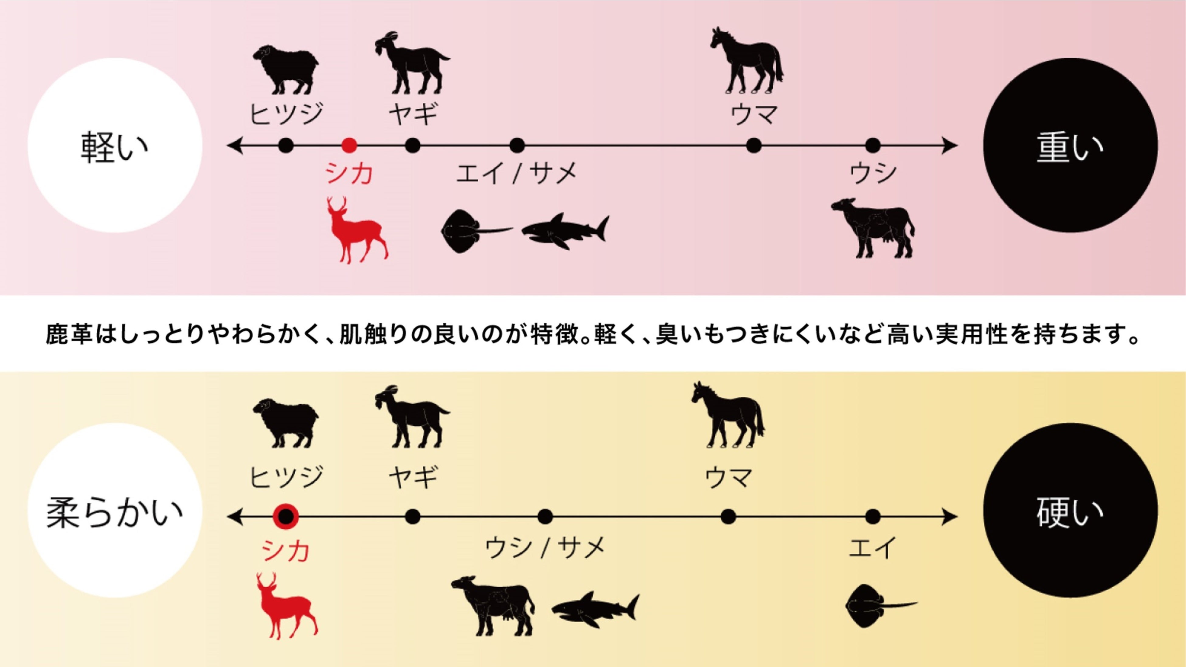 レザーのカシミヤとも呼ばれるほど軽くて柔らかく、クセになる触り心地。湿気に強いうえ乾きやすく、型崩れしにくいので長く使える。