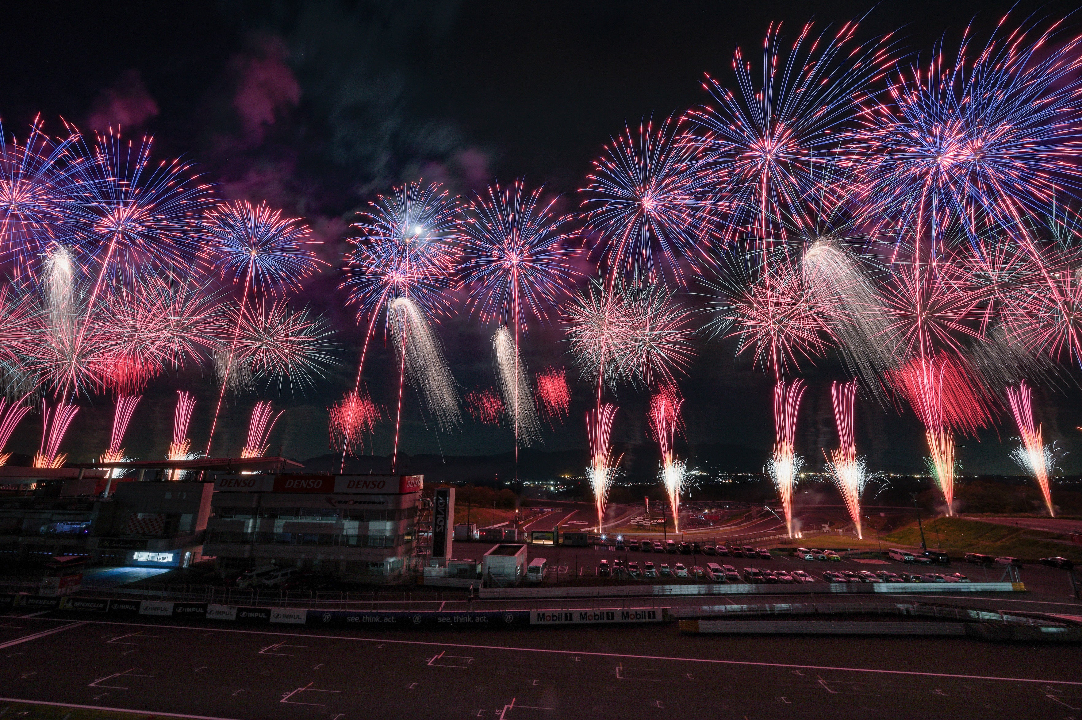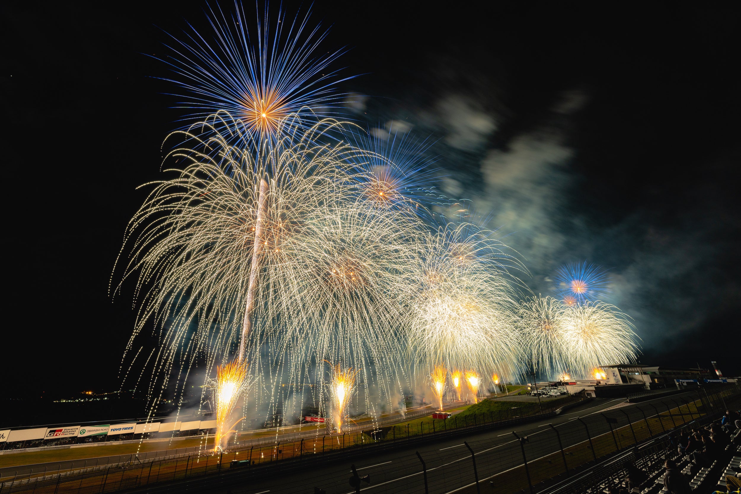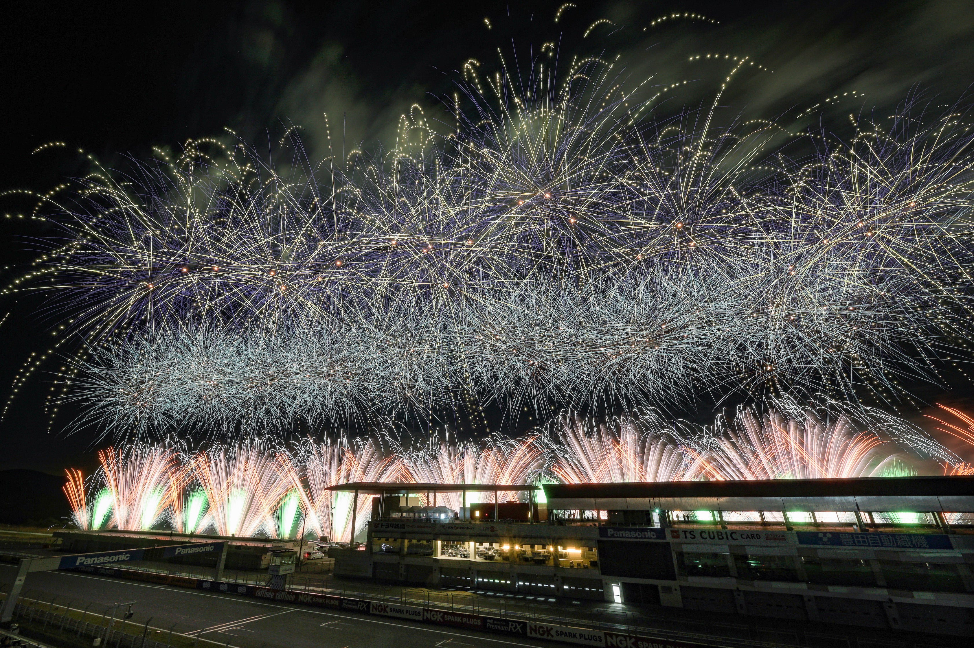 花火の製作には、静岡県が誇る花火企業イケブンをはじめ、片貝煙火工業、野村花火工業と、国内最高峰の花火師たちが集結。世界でも有数の長さを誇る約1.5kmのホームストレート沿いに花火が打ち上がり、またオープニング演出では、高速でコースを駆け抜けるクルマと花火が並走しました。