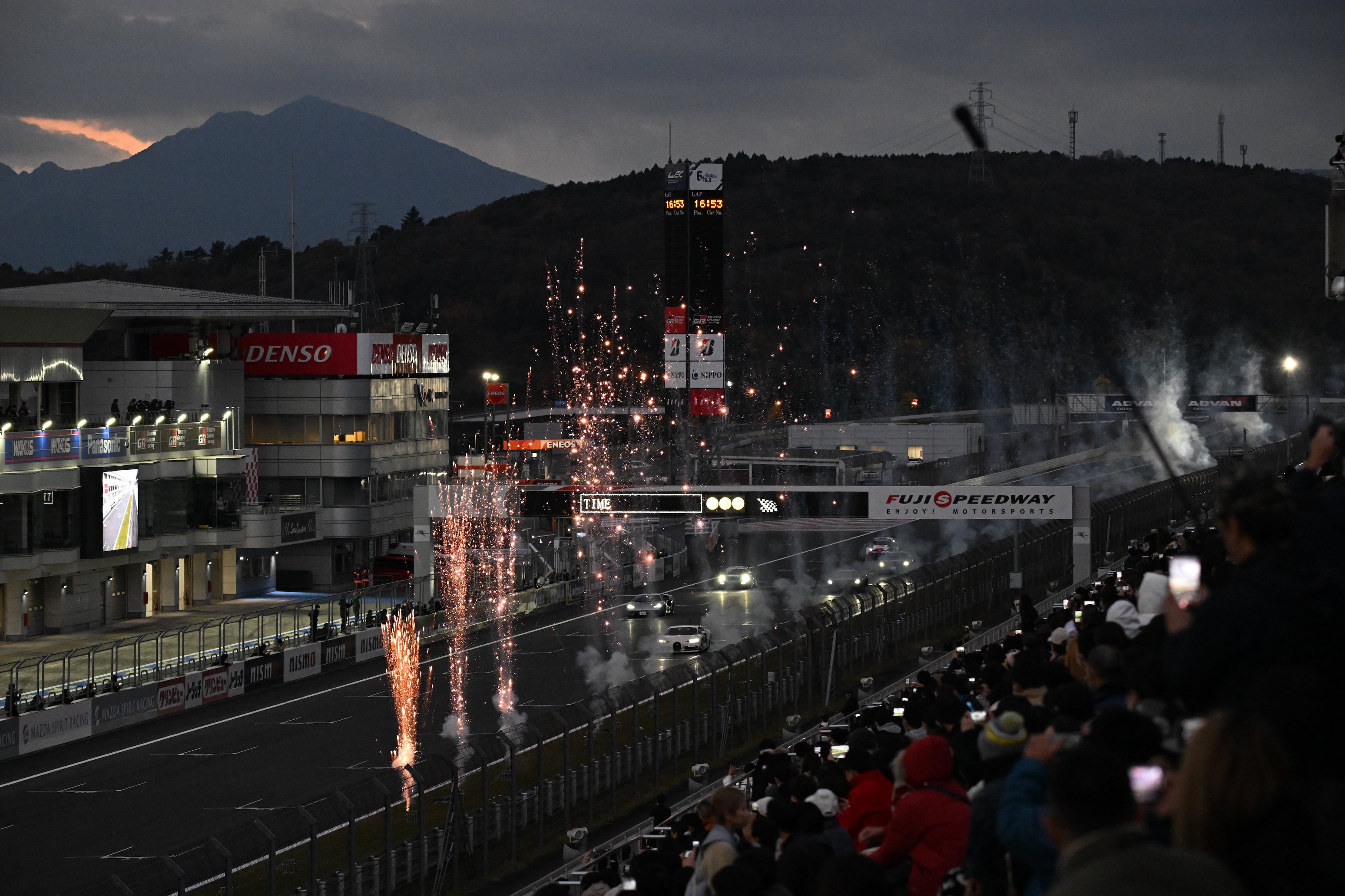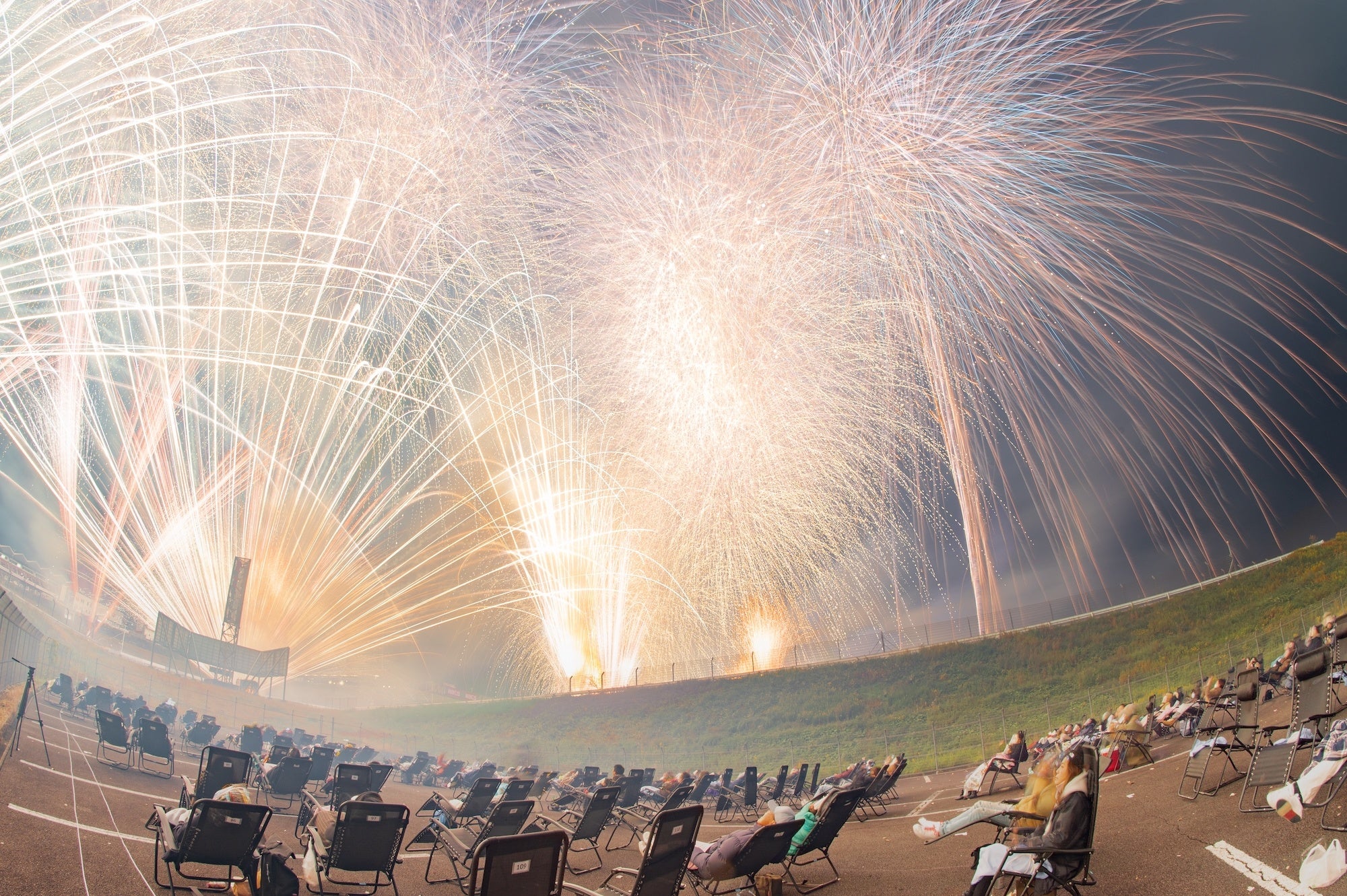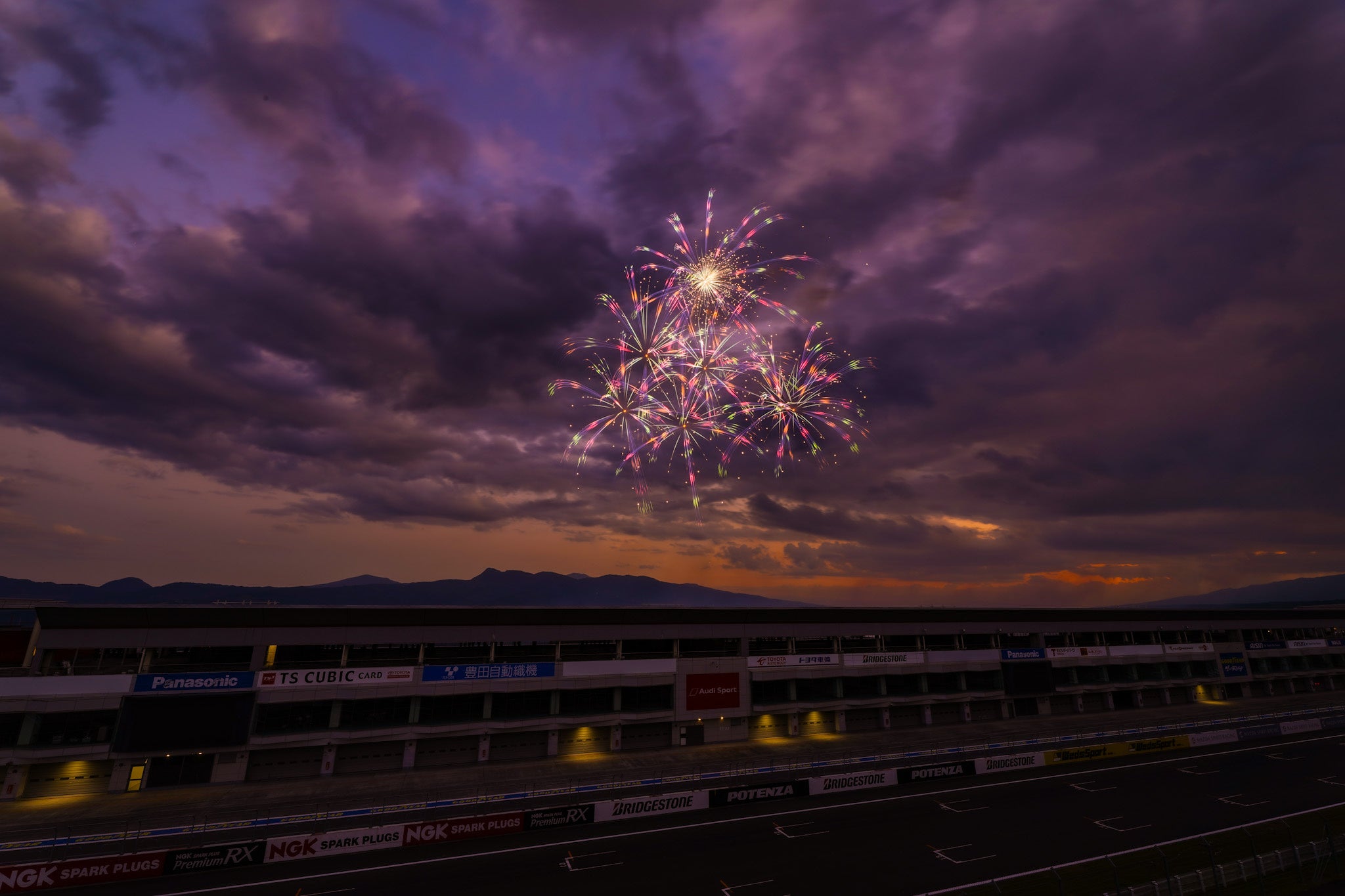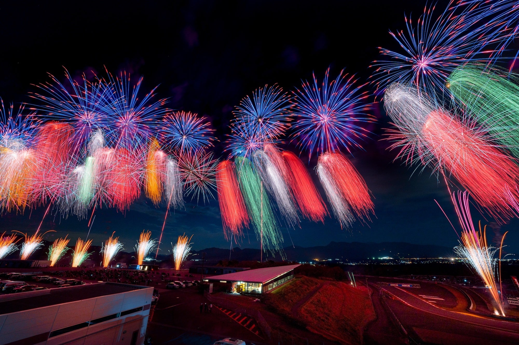 花火の製作には、静岡県が誇る花火企業イケブンをはじめ、片貝煙火工業、野村花火工業と、国内最高峰の花火師たちが集結。世界でも有数の長さを誇る約1.5kmのホームストレート沿いに花火が打ち上がり、またオープニング演出では、高速でコースを駆け抜けるクルマと花火が並走しました。
