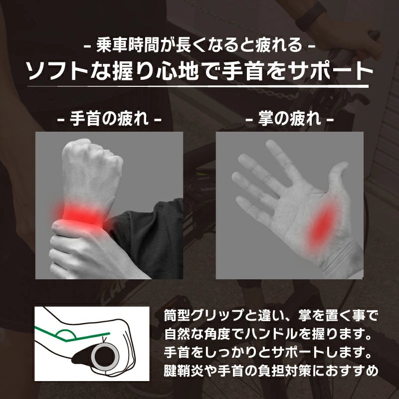 エルゴデザインなので掌をグリップ全面に置く事で長時間の走行でも疲れを軽減します。