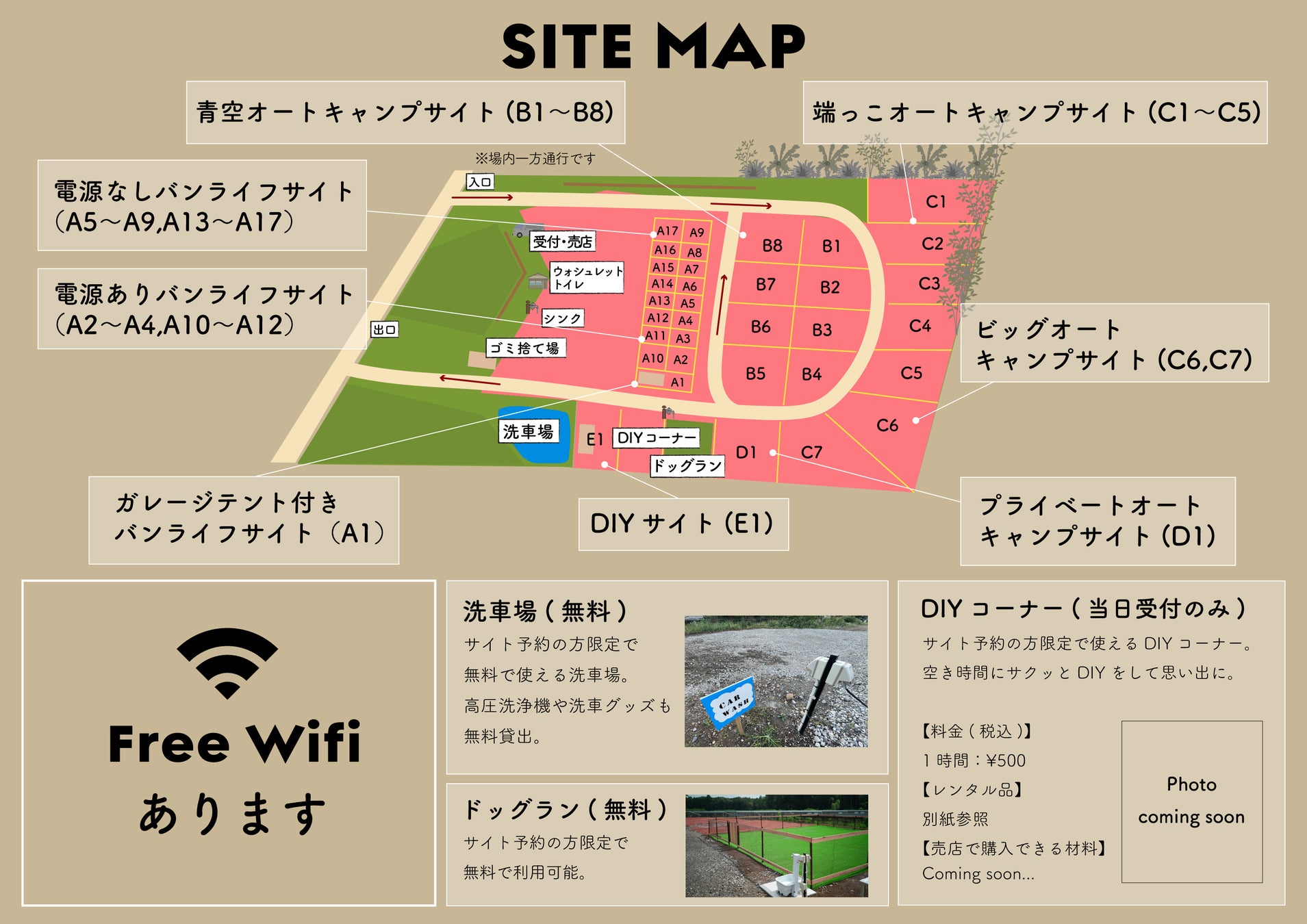 キャンプ場内には、オートキャンプサイトと車中泊サイトの他に、ドッグラン・プライベートサイト・DIYサイト・無料洗車場などもあり、さまざまな車遊びを体験できるフィールドとなっています。