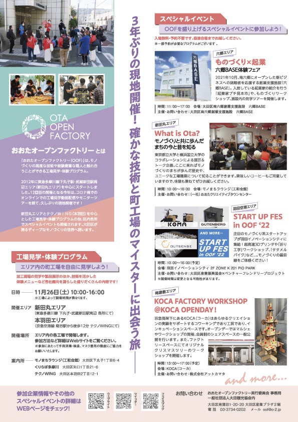 今秋、おおたオープンファクトリー実行委員会は、「おおたオープンファクトリー2022」をコロナ禍での2年間に渡るオンラインでの動画配信を経て、3年ぶりに現地でリアル開催します。