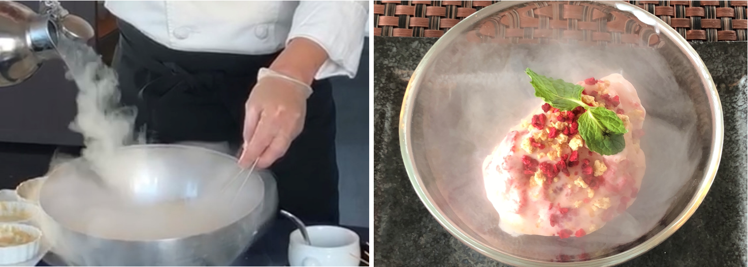 アントレーズでは、一部コースの食後のデザートに、液体窒素の演出を取り入れたアイスをご提供しています。