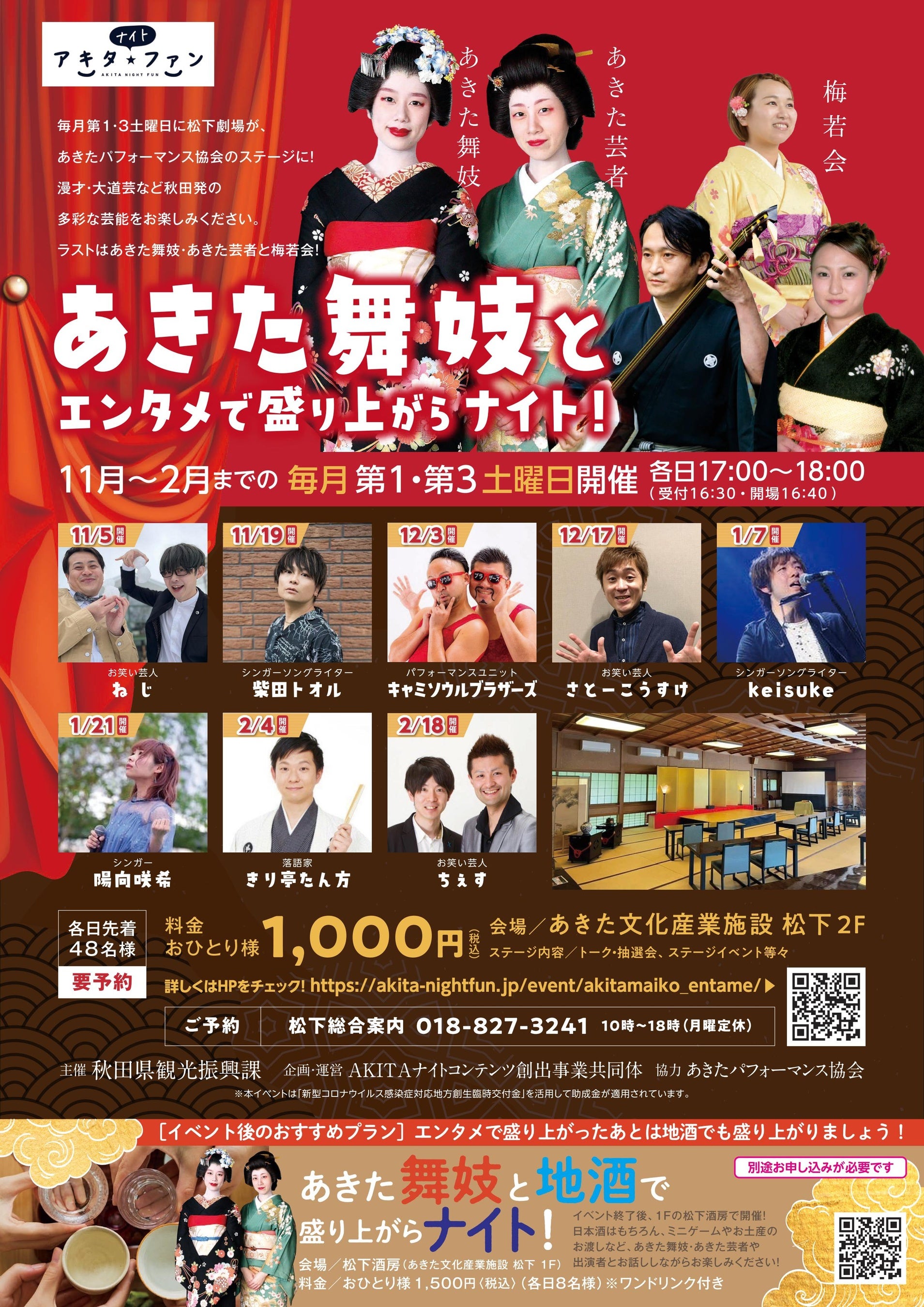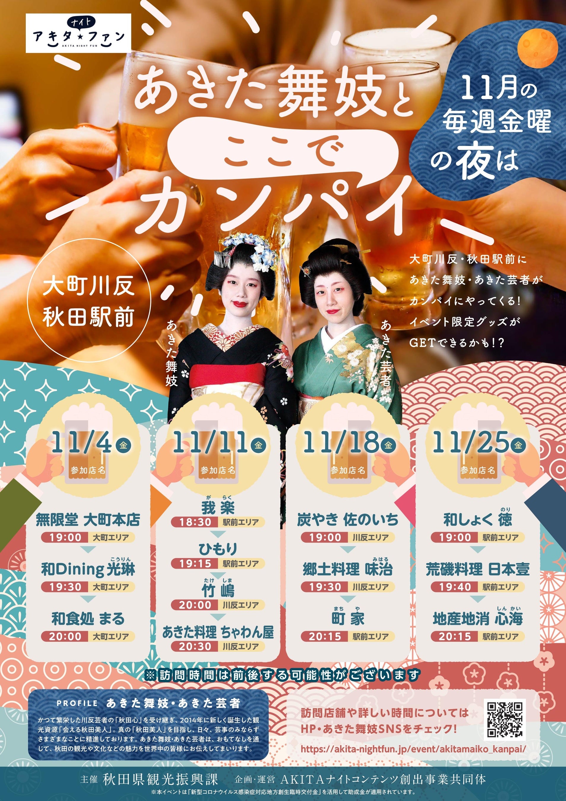ナイトタイムコンテンツの造成・磨き上げを行うとともに、 あきた舞妓・あきた芸者、 秋田民謡等、 料亭文化に携わる事業者を支援するために、 次のとおりイベントを開催します。