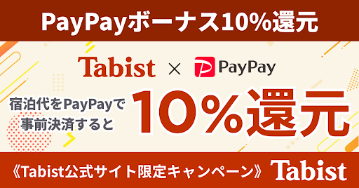 Tabist公式サイトにて3000円以上の宿泊代をPayPayで事前決済すれば、10%分のPayPayボーナスが還元されます。期間中は最大2000円まで付与となります。