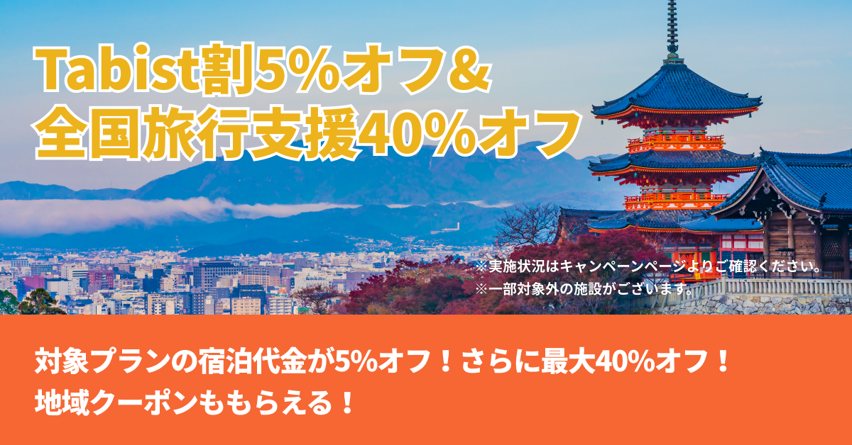 公式サイトからの予約で、全国旅行支援40%オフと併用可能となる「Tabist割5%オフキャンペーン」を開催中。さらに平日3,000円・休日1,000円の地域クーポンがもらえます。