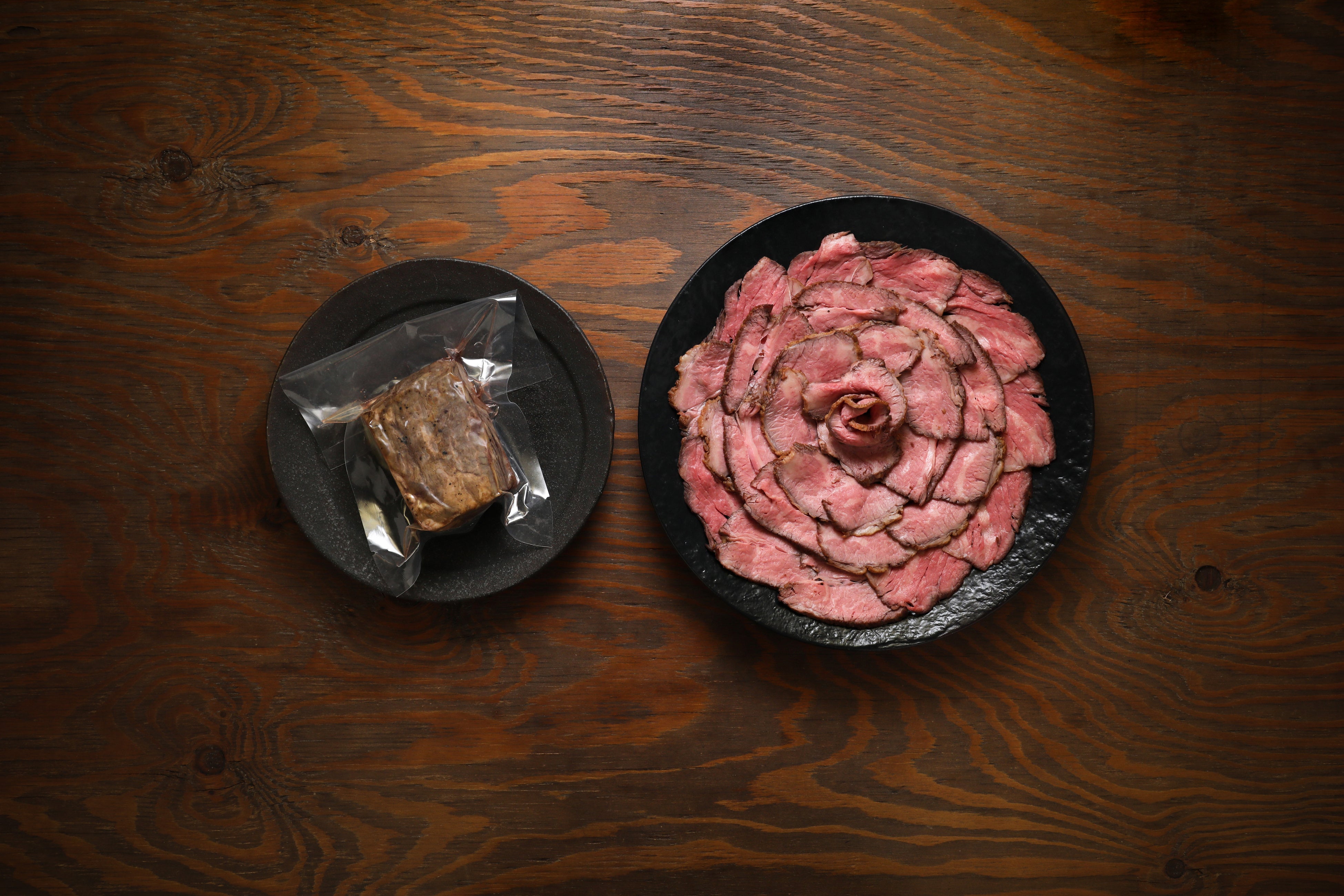 オーブンで一時間以上かけて低温調理しておりますので、肉らしい弾力がありながら柔らかいのが特徴です。秋田肉醤シャリアピンソースと一緒に食べることを前提に余計な味付けをせず、脂の旨味と風味を追求し、口当たりの良さに特化した赤身肉ローストビーフです。