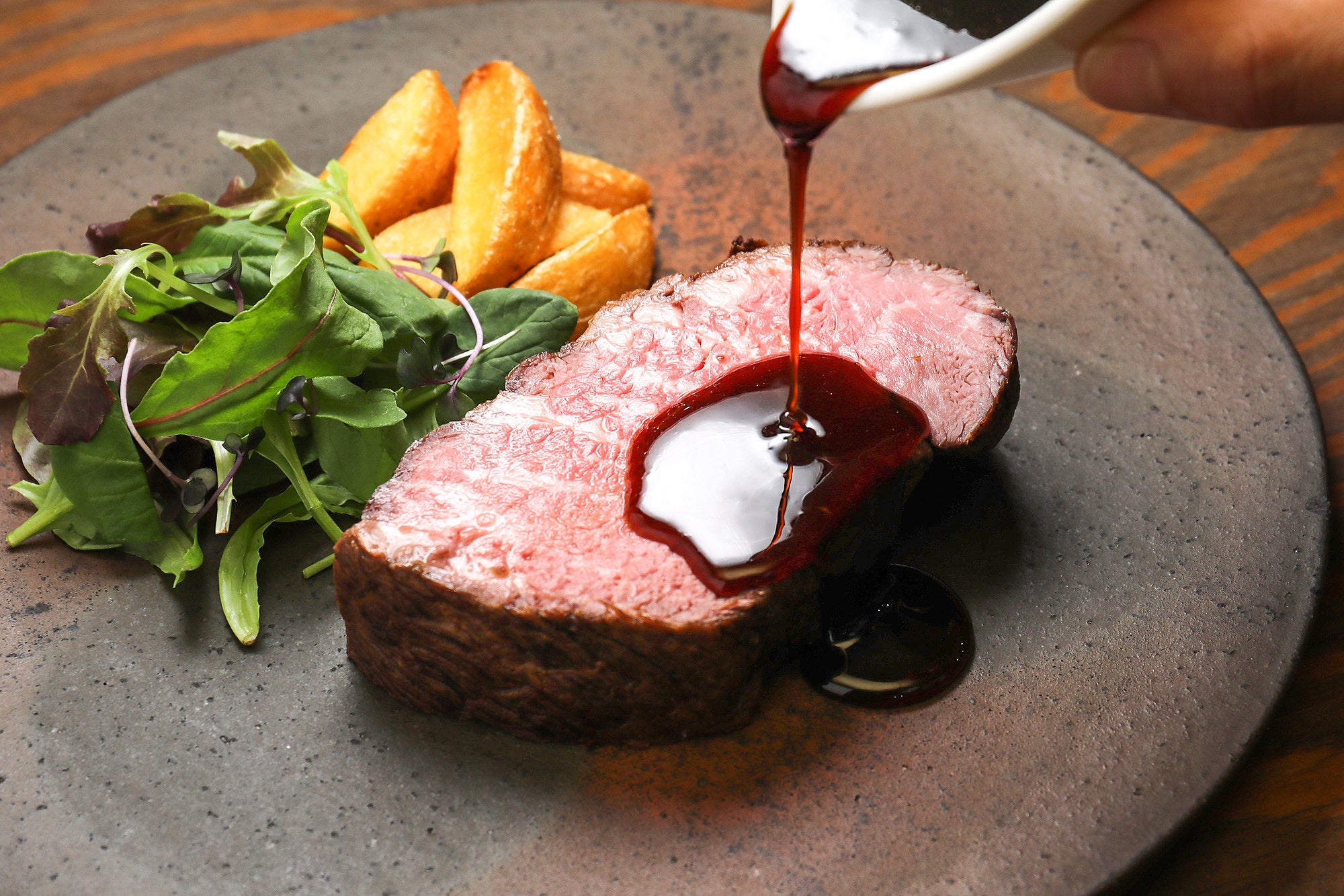 ニンニクや玉ねぎといった香味野菜の風味と甘味、しっかりと煮詰めた赤ワインのコク、仕上げにレモンの爽やかな香りを追加して、肉醤の旨味を最大限に楽しんでいただけるソースに仕上げました。このソースを赤身肉とペアリングすると、味に深み、強みが増し、はっきりとした輪郭があらわれます。