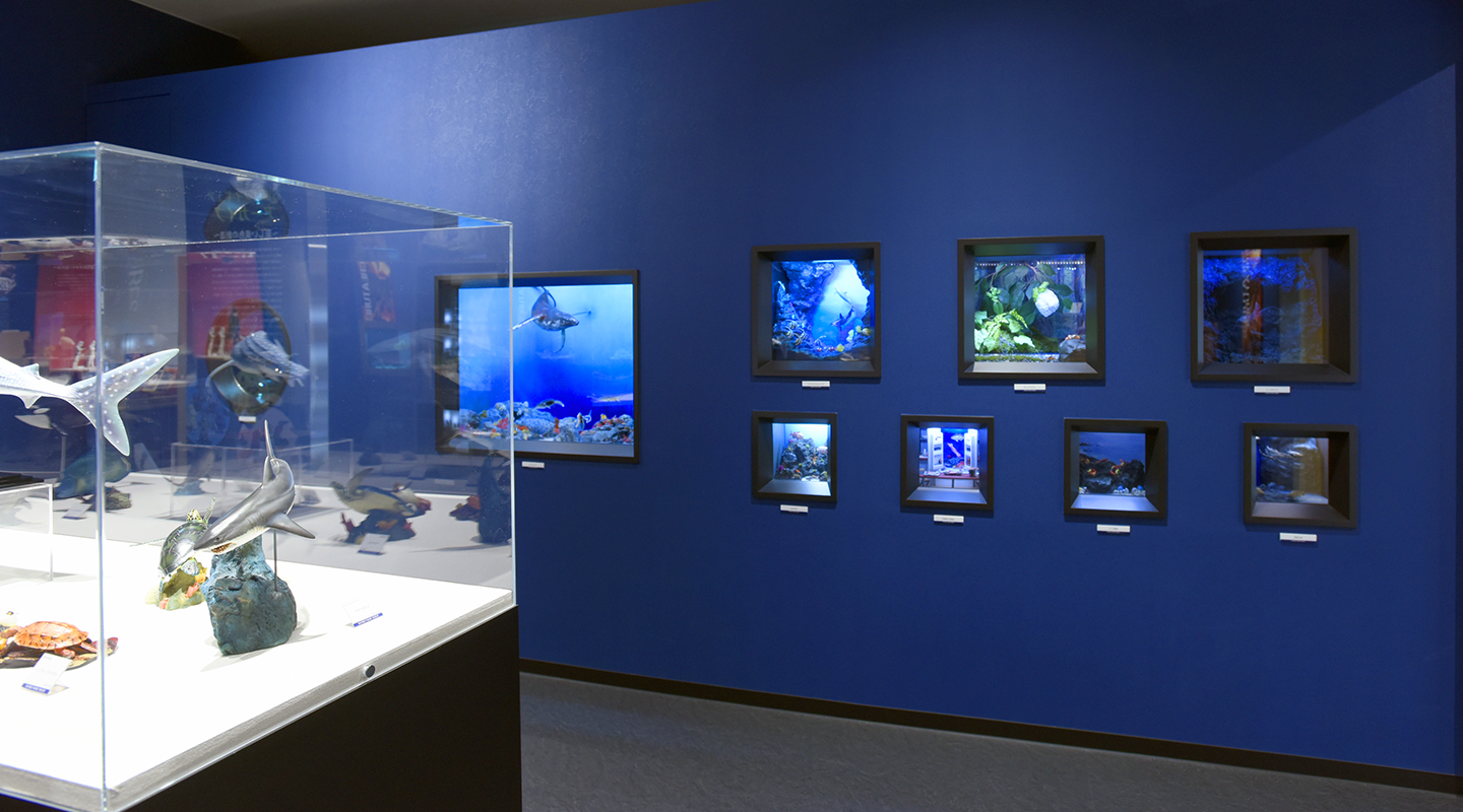 展示手法については、壁面にフレームのある窓を作り、その窓の中でフィギュアを展示することによって、フレームと照明の効果で作品をより際立たせ、没入感を高める手法を用いました。この展示手法は「海洋堂フィギュアミュージアム ミライザ大阪城」の大きな特徴と言えます。