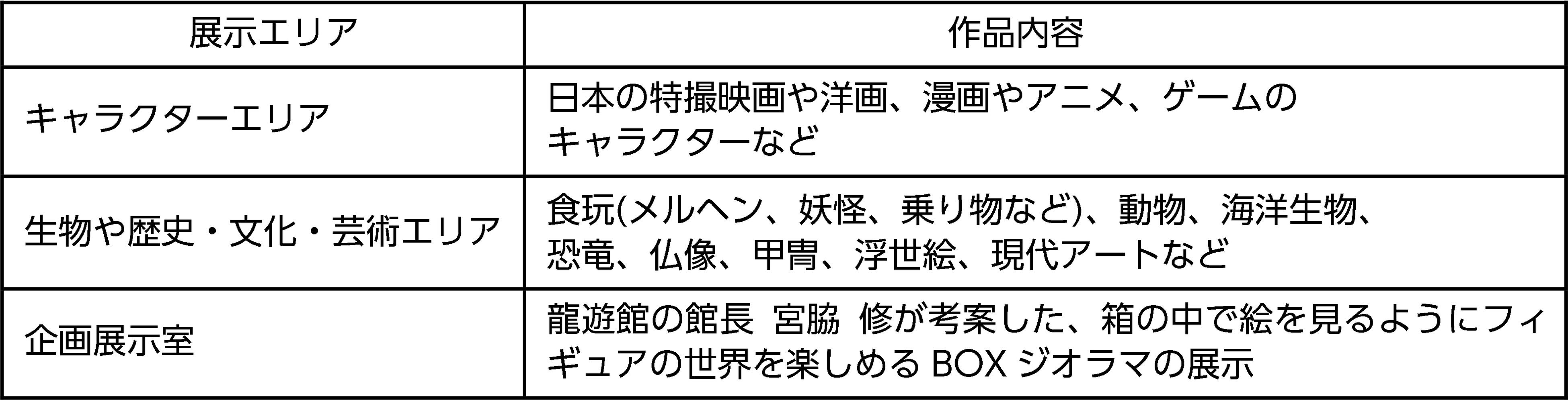展示構成も、他施設が、フィギュアの制作年代別や造形師別に作品を展示しているのに対して、「海洋堂フィギュアミュージアム ミライザ大阪城」は、フィギュアを“モチーフ”ごとに、エリアを分けて展示することで、一つのエリア内で同じモチーフのフィギュアを一堂に見ることができます。構成の前半を「キャラクター」エリア、後半を「生物や歴史文化・芸術」エリアに大きく分けました。更にフィギュアのモチーフや種類により、複数のブースに分けることによって、見るものを飽きさせない、メリハリのある展示となるようにいたしております。その中でポップカルチャーのみならず、日本の歴史や文化をフィギュアを通して広く紹介して参ります。