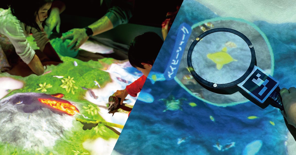 AR(拡張現実)技術を使った不思議な砂場に「ベイビーシャーク」たちが登場。「魔法の虫眼鏡」をかざして名前を調べることができます。