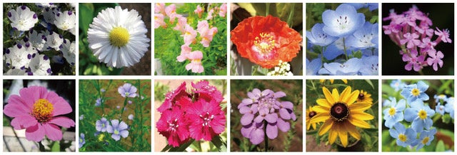 ネモフィラファイブスポット、キャンディタフト、ネモフィラベビーブルーアイ、ウォールフラワー、ブルーフラックス、ヒゲナデシコ、百日草、ひなげし、キンギョソウ、虫取りナデシコ、イングリッシュデイジー、ルドベキアヒルタ、わすれな草などがランダムで入っています。