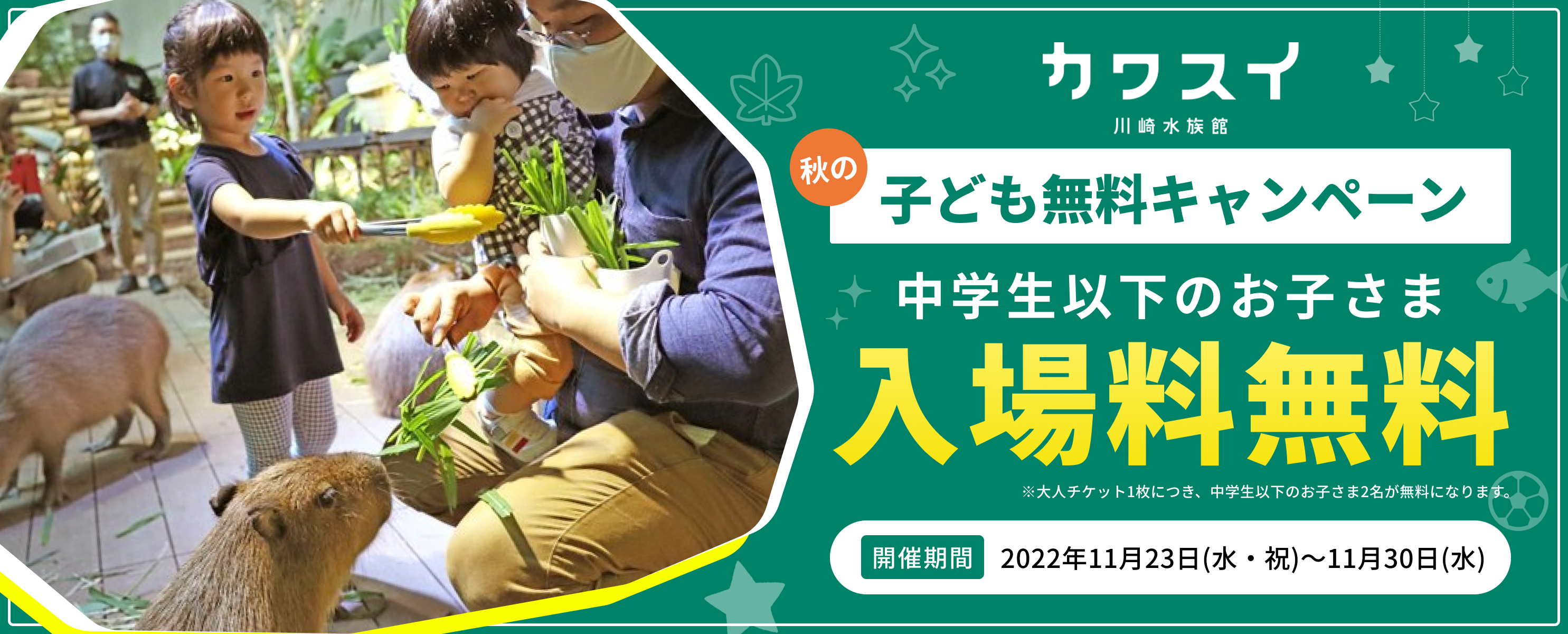 カワスイ 川崎水族館(所在地:神奈川県川崎市、館長:岩岡千香子、以下カワスイ)は、2022年11月23日(水・祝)~2022年11月30日(水)の期間限定で、中学生以下のお子さまの入館料が無料になる「カワスイ 子ども無料キャンペーン」を実施いたします。