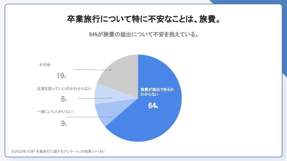 - 卒業旅行の不安なことは「旅費の捻出」が最多。「周囲の目が気になる」という回答も