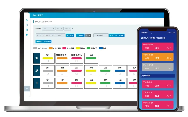 ・清掃管理アプリ、ルームインジケーター「HOT/TEL C」