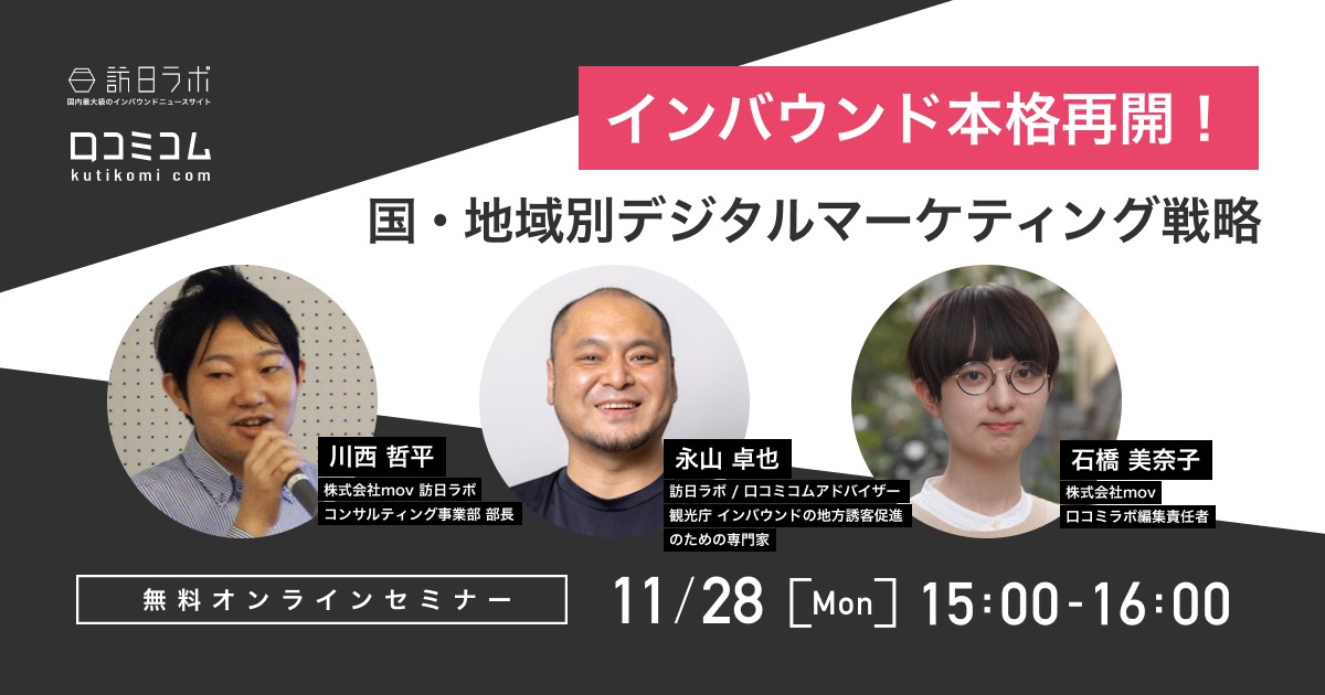 インバウンド業界最大級メディア「訪日ラボ」、口コミサイトを”もっと”売上に変えるAI店舗支援SaaS「口コミコム」を運営する株式会社mov(代表取締役:渡邊 誠、本社:東京都渋谷区、以下mov)は、セミナー「インバウンド本格再開!国・地域別デジタルマーケティング戦略」を開催いたします。日程は11月28日(月)15〜16時、参加費は無料です。