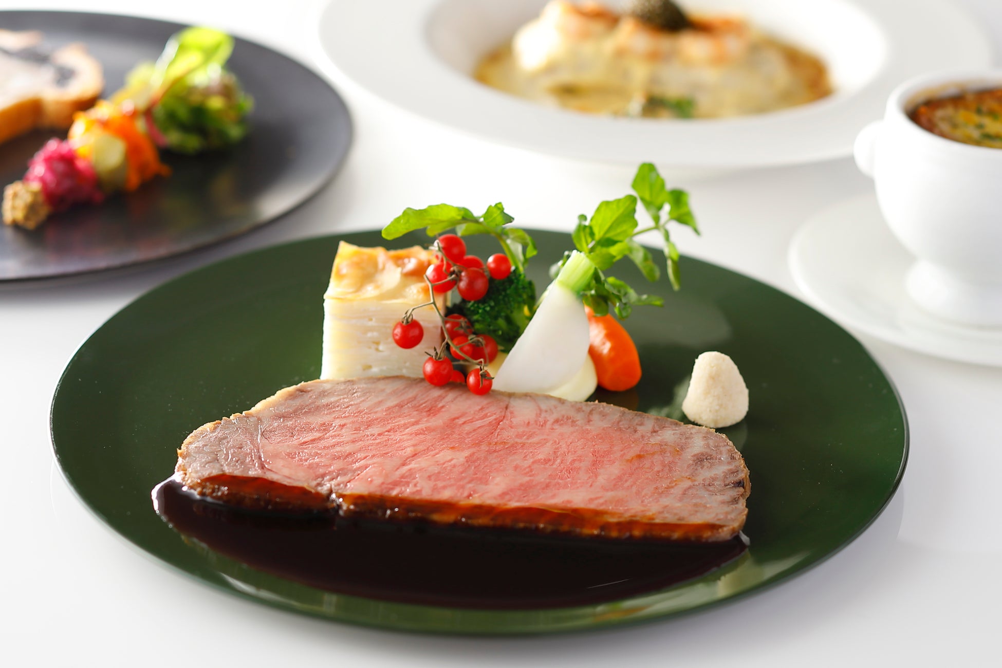 王道洋食メニューを贅沢にコースで堪能できるクリスマスプレミアムメニューもご用意。岩手県産のブランド豚、岩中豚を使用したパテ・アン・クルートの前菜に、玉葱の旨味が溶け込むオニオングラタンスープ。メインディッシュは、キャビア添えのドーバー産舌平目のグラタン”ボンファム”または、国産牛背肉のローストビーフからお選びいただけます。カカオとろけるフォンダンショコラに、濃厚なヴァニラアイスクリームが添えられたデザートを含む4品のコースは、大人のクリスマスディナーにお薦めです。