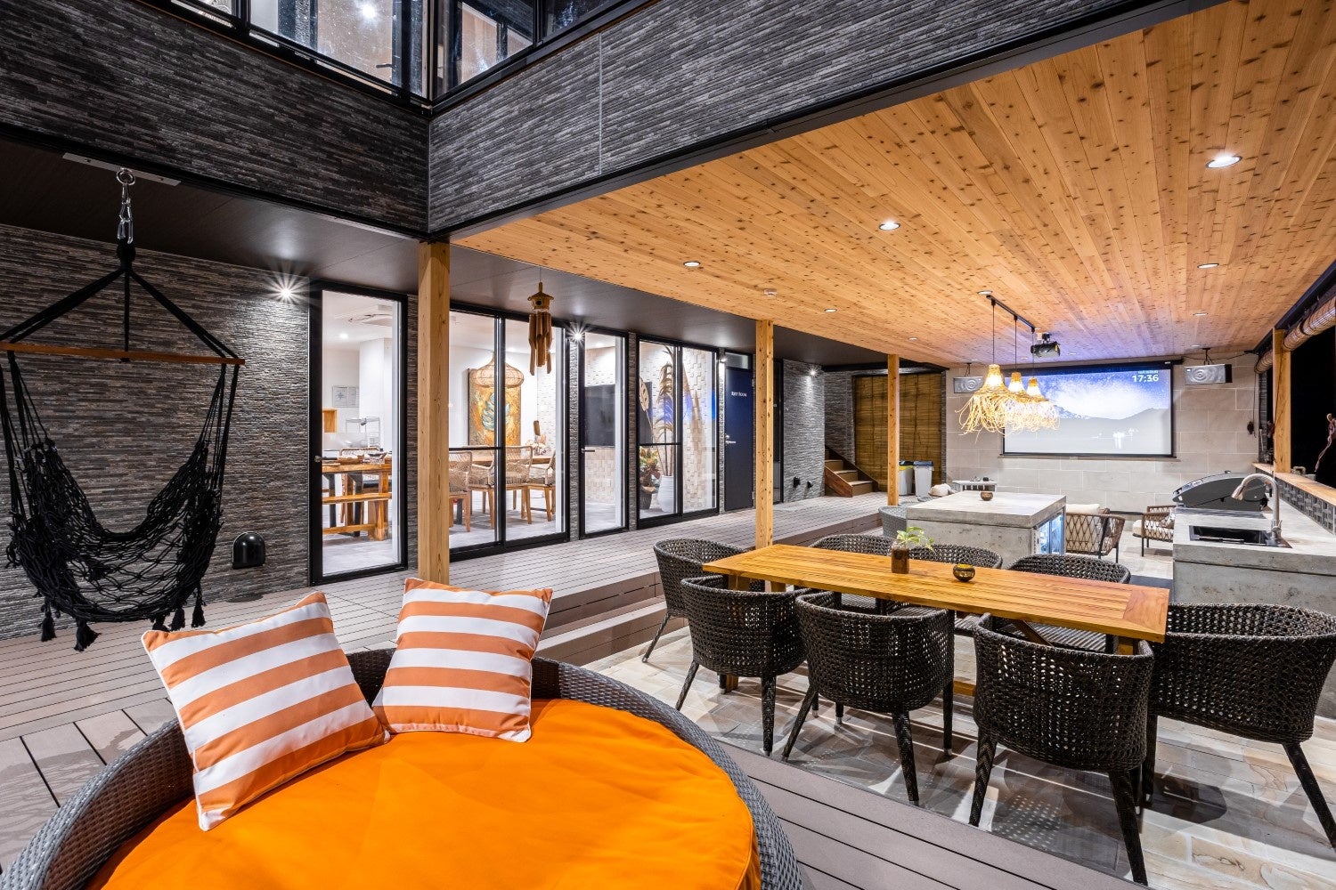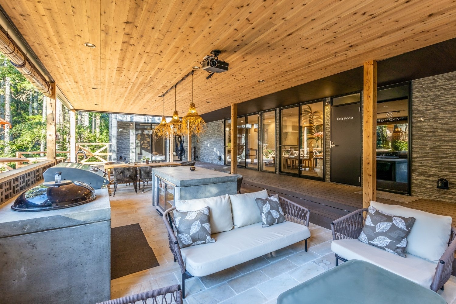 こだわりの調理設備に囲まれた全天候型のアウトドアリビングなど、