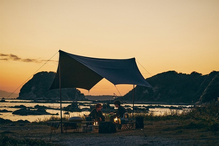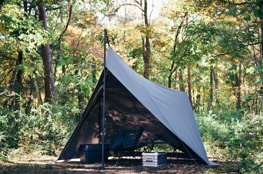 タープの商品名は『マカオンTC』。マカオンとはフランス語で“アゲハ”を指す言葉。その名の通り羽を広げたアゲハ蝶の美しいシルエットからイメージされたタープ。こちらもTC素材を使用したヘキサ型のタープは4m×4mで、2〜4人でのキャンプにちょうどいいサイズ感。