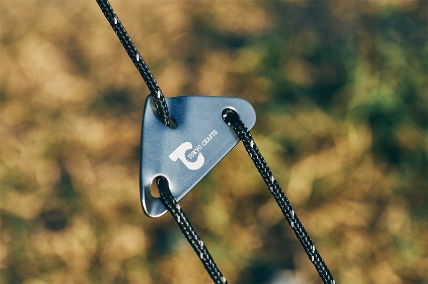 テント同様、グレーを基調としたカラーリングです。コットン混紡なので、難燃とまではいかずとも火の粉には多少の強さを持っています。シームにはフィルムを貼っていないため防水ではないものの、撥水性はあり、遮光性、通気性が高いので、タープの出番が多い夏場に大活躍が期待できます。長さ調節がしやすい自在付き、リフレクター付きのガイロープは、暗闇での視認性が高めれられ、ファミリーキャンプにもおすすめです。