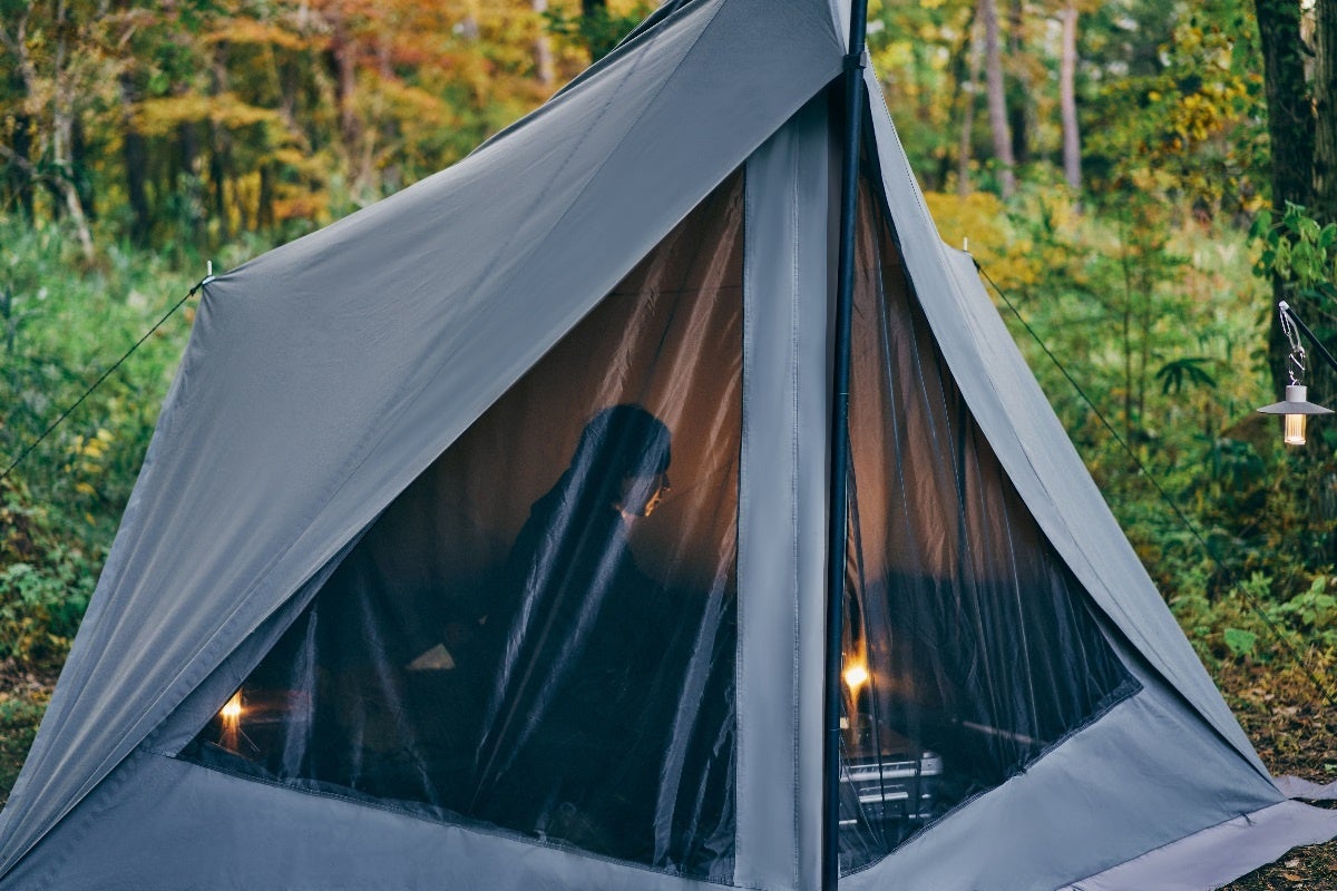 ”ダイヤモンド張り”を思わせるフォルムとグレーカラーが織りなすシャープで洗練されたデザイン。「視界が広く開放的なリビング」と「過不足のない寝室」を効率よくレイアウトし、ミニマムでありながら快適な空間を実現したテント、『ダイヤフォートTC』。
