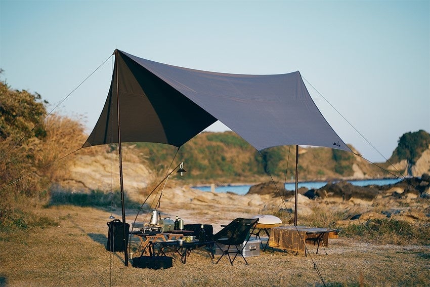 テント同様、グレーを基調としたカラーリングです。コットン混紡なので、難燃とまではいかずとも火の粉には多少の強さを持っています。シームにはフィルムを貼っていないため防水ではないものの、撥水性はあり、遮光性、通気性が高いので、タープの出番が多い夏場に大活躍が期待できます。長さ調節がしやすい自在付き、リフレクター付きのガイロープは、暗闇での視認性が高めれられ、ファミリーキャンプにもおすすめです。