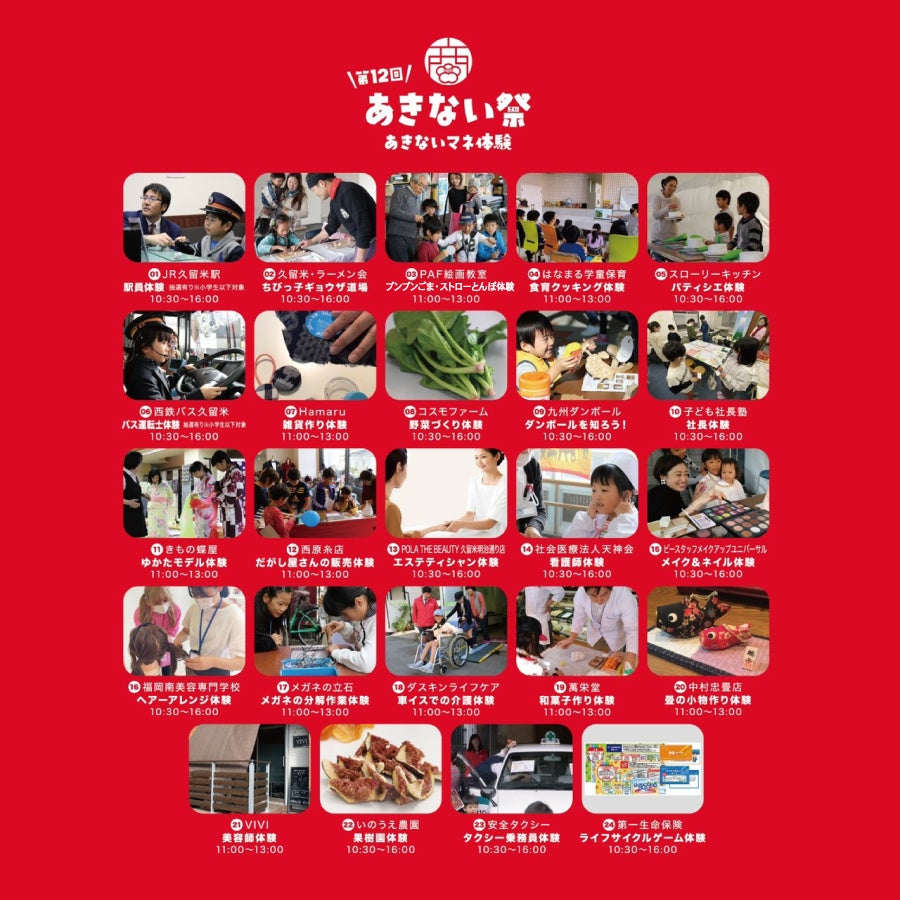 駅員体験(JR久留米)、ちびっ子ギョウザ道場(久留米・ラーメン会)、ブンブンごま・ストローとんぼ体験(PAF絵画教室)、食育クッキング体験(はなまる学堂保育)、パティシエ体験(スローリーキッチン)、バス運転士体験(西鉄バス久留米)、雑貨作り体験(Hamaru)、野菜作り体験(コスモファーム)、ダンボールど知ろう!(九州ダンボール)、社長体験(子ども社長塾)、ゆかたモデル体験(きもの蝶屋)、だがし屋さん体験(西原糸店)、エステティシャン体験(POLA THE BEAUTY久留米明治通り店)、看護師体験(社会医療法人天神会)、メイク&ネイル体験(ビースタッフメイクアップユニバーサル)、ヘアーアレンジ体験(福岡南美容専門学校)、メガネの分解作業体験(メガネの立石)、車イスでの介護体験(ダスキンライフケア)、和菓子作り体験(萬栄堂)、畳の小物作り体験(中村忠畳店)、美容師体験(VIVI)、果樹園体験(いのうえ農園)、タクシー乗務員体験(安全タクシー)、ライフサイクルゲーム体験(第一生命保険)
