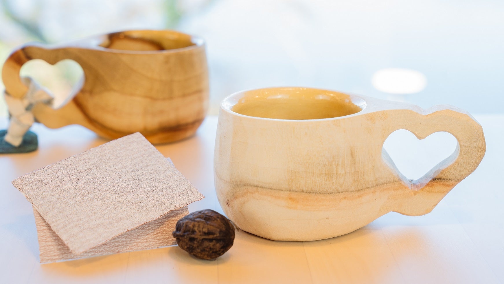 自分で磨いて胡桃オイルを塗って完成!取っ手がハート型のククサカップ。