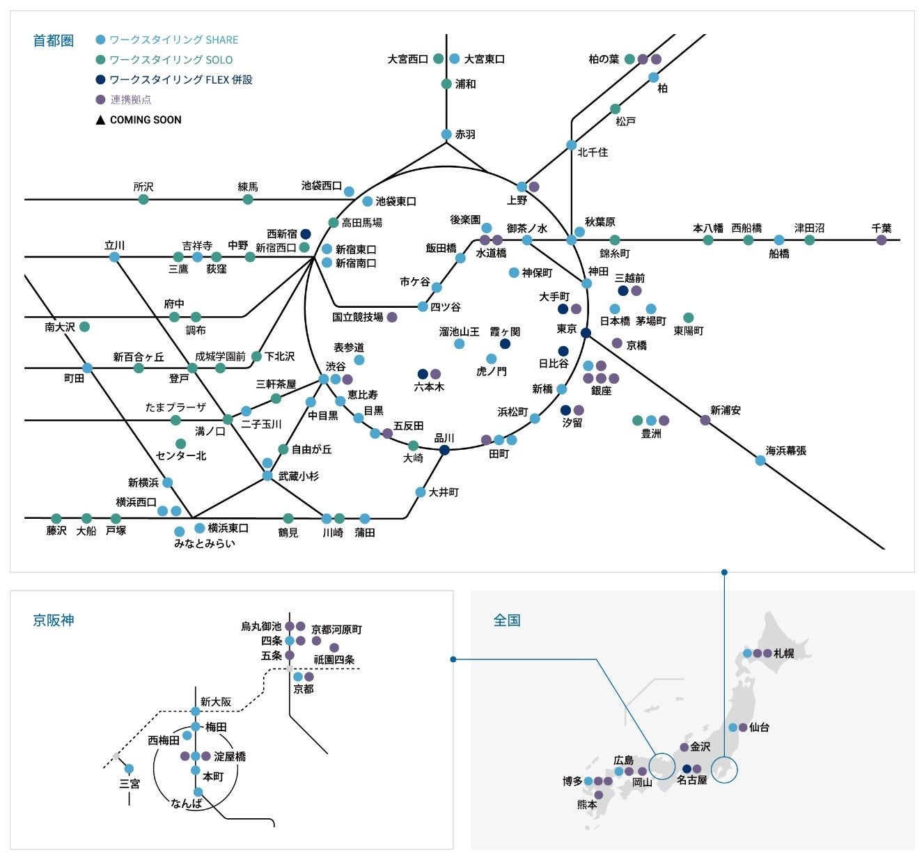 「ワークスタイリング」は2017年4月より開始した法人会員向けシェアオフィスで、約900社、約24万人にご契約いただいています(2022年11月17日時点)。全国に広がる拠点を10分単位で利用可能な法人向け多拠点型サテライトオフィス「ワークスタイリングSHARE」、郊外エリアを中心とした法人向け個室特化型サテライトオフィス「ワークスタイリングSOLO」、多様化する企業のニーズや様々なビジネスシーンに合わせた法人向けフレキシブルサービスオフィス「ワークスタイリングFLEX」を全国109拠点で展開しています。三井不動産グループで提供する「ザ セレスティンホテルズ」「三井ガーデンホテルズ」「sequence」「東京ドームホテル」の提携40拠点と併せて、2022年11月17日時点で149拠点を展開しています。