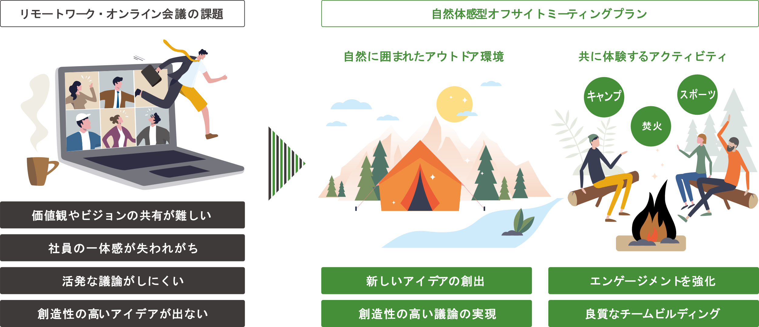 豊かな自然に恵まれたアウトドア施設という非日常空間が新しいアイデアや創造性の高い議論を引き出すとともに、焚火やテント設営などの共に体験するアクティビティを通じて生まれる深いコミュニケーションがエンゲージメントを強化し、良質なチームビルディングを実現します。