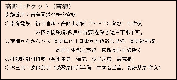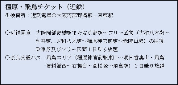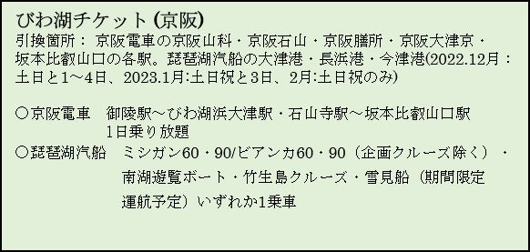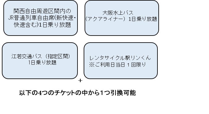 〇関西自由周遊区間内のJR普通列車自由席、大阪水上バス(アクアライナー)・江若交通バス(浜大津線(堅田駅~大津駅)、日吉台線(比叡山坂本駅~西教寺)、ケーブル線(比叡山坂本駅~ケーブル坂本駅)、堅田町内線(堅田駅~堅田出町)、琵琶湖大橋線(堅田駅~勾当内侍前)※シャトルバス・奥比叡ドライブウェイ線除く)が1日乗り放題、レンタサイクル駅リンくん1回利用(大人用自転車のみ)に加え、びわ湖チケット、高野山チケット、橿原・飛鳥チケット、有馬温泉チケットのいずれかと交換が出来る引換券がセットになっています。